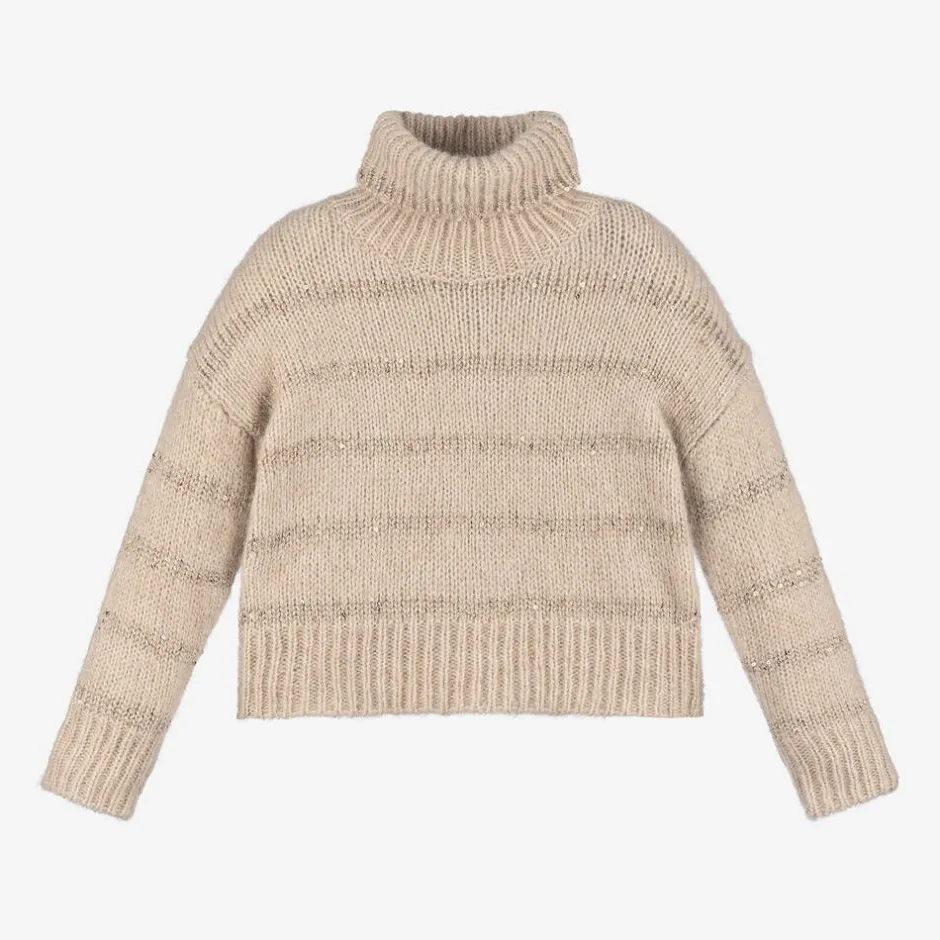 A gorgeous beige rollneck sweater for girls by Spanish brand Abel & Lula. It is patterned in pale gold stripes, embellished with shiny gold sequins for added sparkle. Cosy and comfortable, it is made in a soft and fluffy knit, with long sleeves. This product contains recycled fibres.