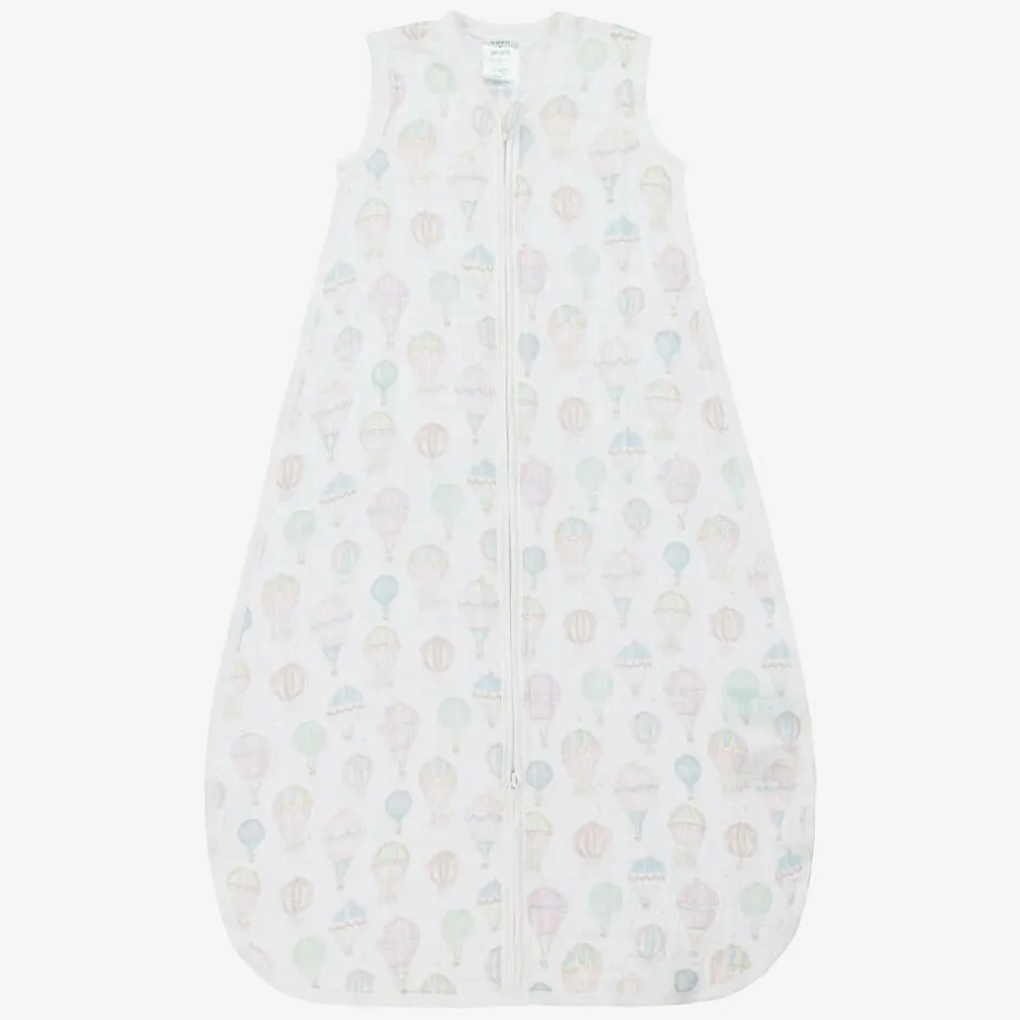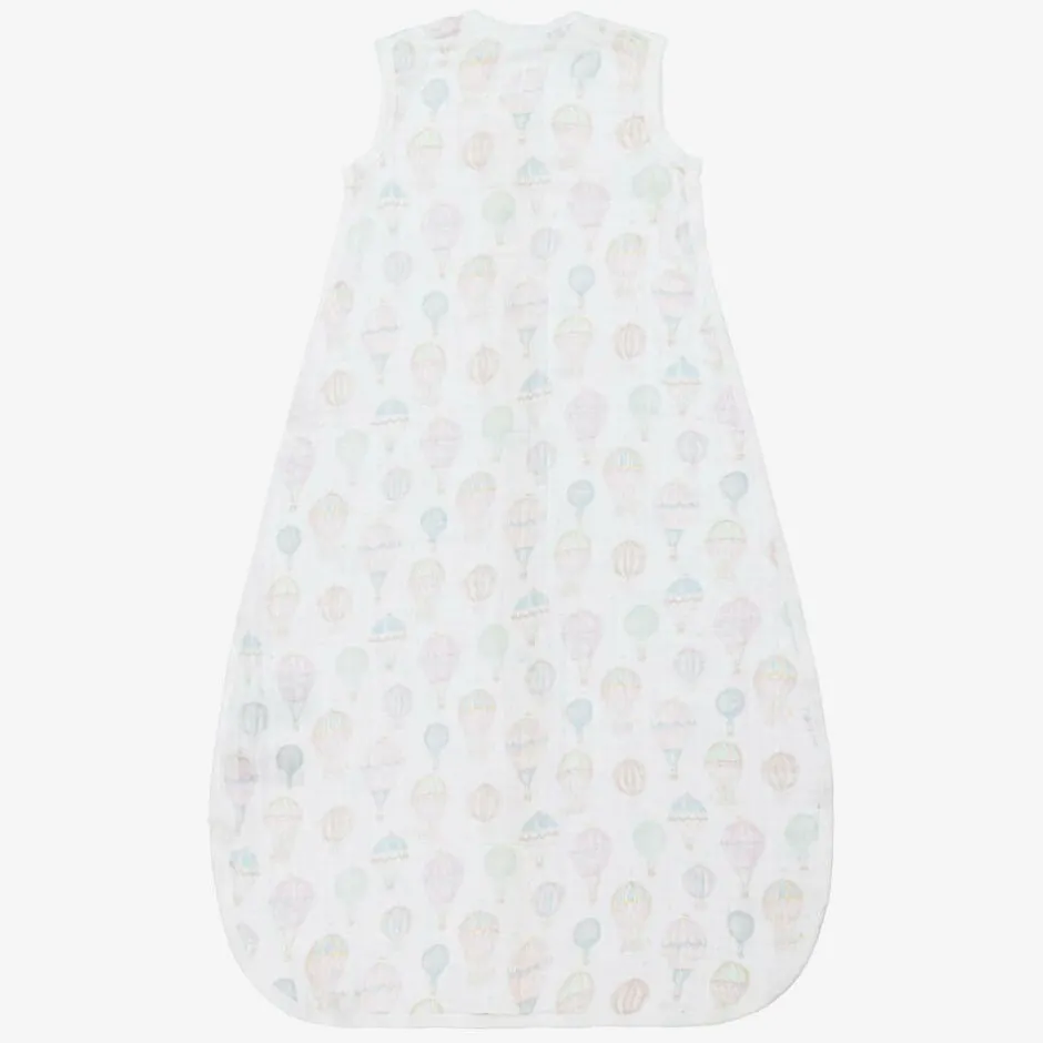 A white sleeping bag for baby boys and girls by aden + anais, made from the softest organic cotton muslin. This sleeping bag is patterned in adorable pastel hot air balloons and fastens with a zip. Lightweight and breathable, it has a 1.0 tog rating to keep your baby warm without overheating.