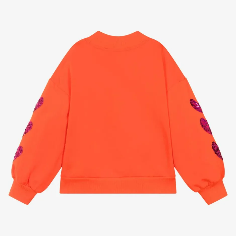 Bright orange cotton sweatshirt for girls by Agatha Ruiz de la Prada, with the brand's signature hearts appliquéd on the long sleeves, shimmering in fuchsia pink sequins. Made in comfortable jersey, with a cosy, fleecy inside and ribbed trims, it has an embroidered pink logo by the neckline and panelled detailing on the front.