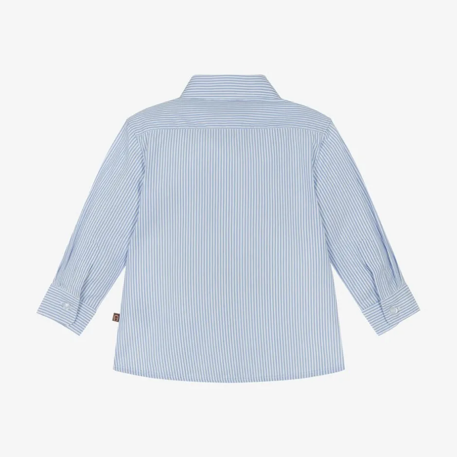 Smart blue and white striped shirt for baby boys by AIGNER, with white panels on the front. Made in soft and lightweight cotton poplin, it fastens with branded buttons on the front and cuffs. An embroidered logo patch on the chest, features the signature 'A' horseshoe logo for a distinctive look.
