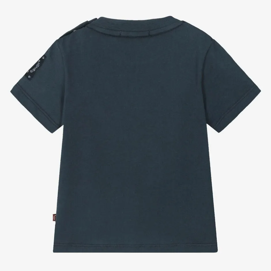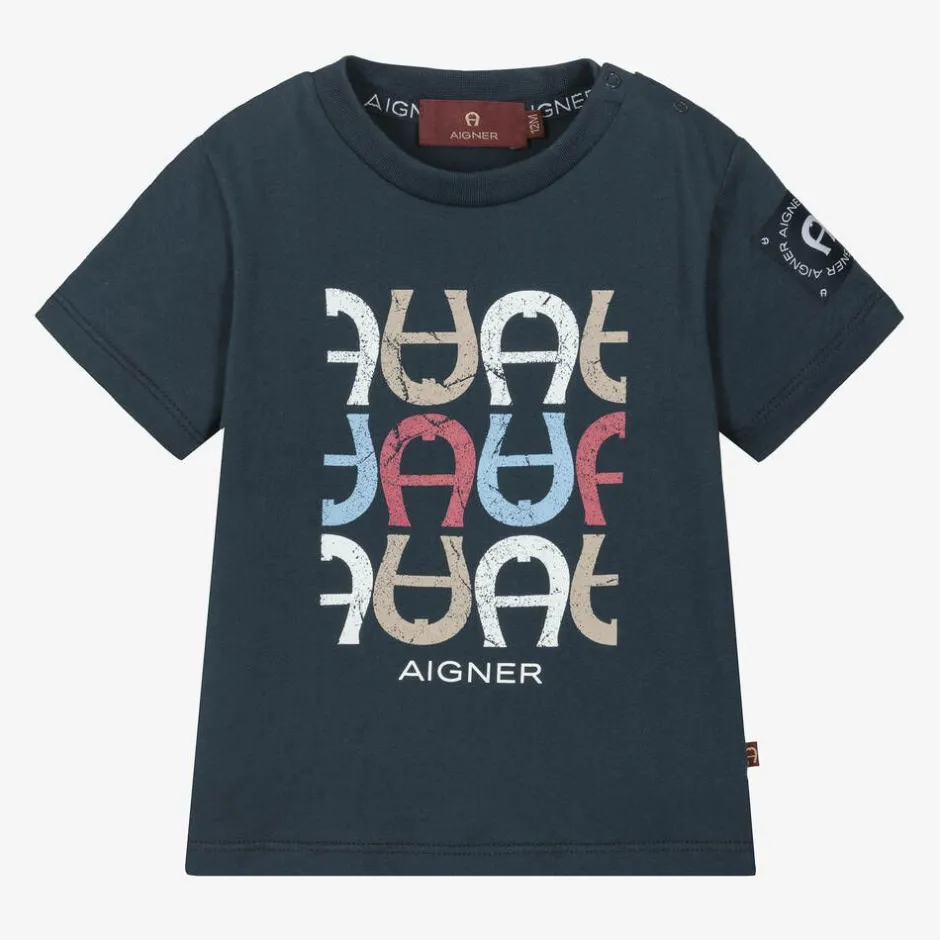 Navy blue T-shirt for baby boys by AIGNER, made in soft and comfortable cotton jersey. It has a colourful 'A' horseshoe logo design printed on the front and poppers on one shoulder to help with dressing.