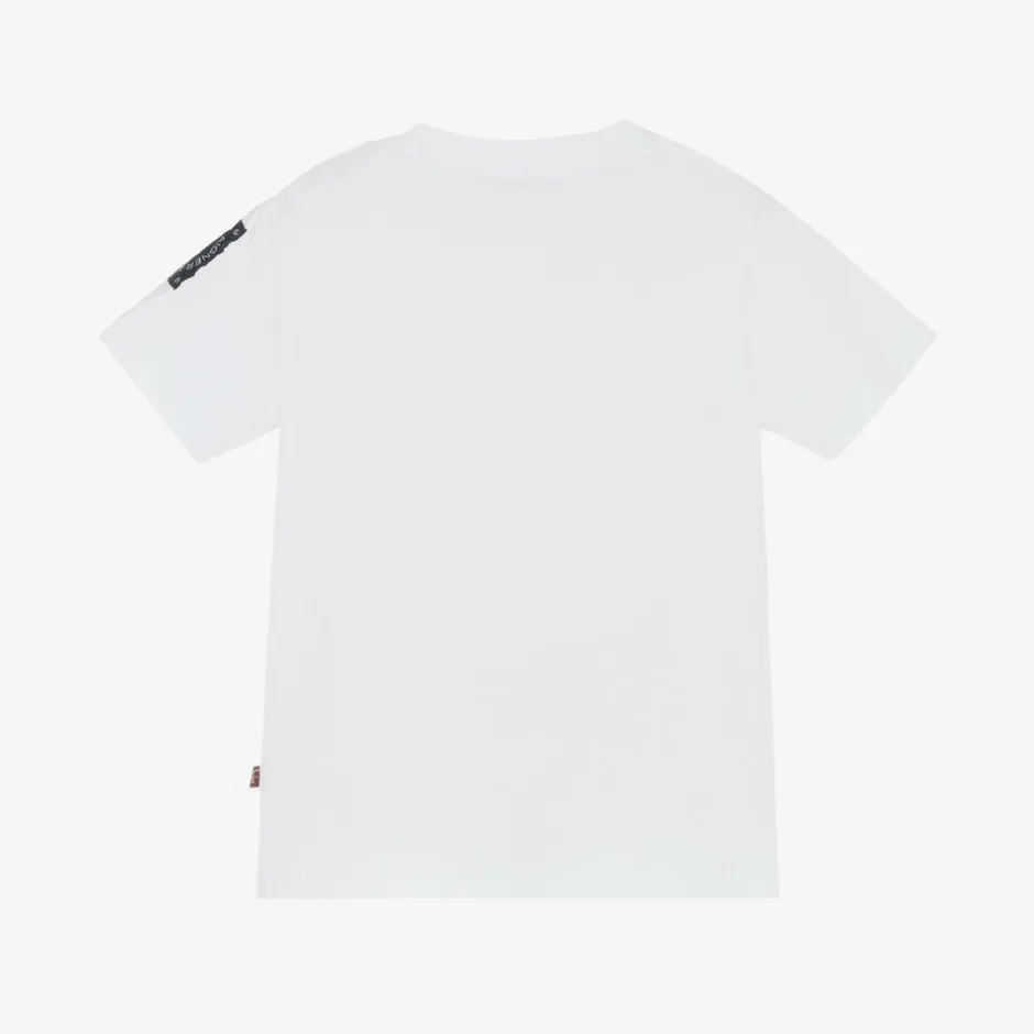 White T-shirt for baby boys by AIGNER, made in comfortable cotton jersey with a logo patch on one sleeve. The front is printed with a bold circular design in metallic gold, featuring the designer's signature 'A' horseshoe logo. There are popper fastenings on one shoulder to assist with dressing.