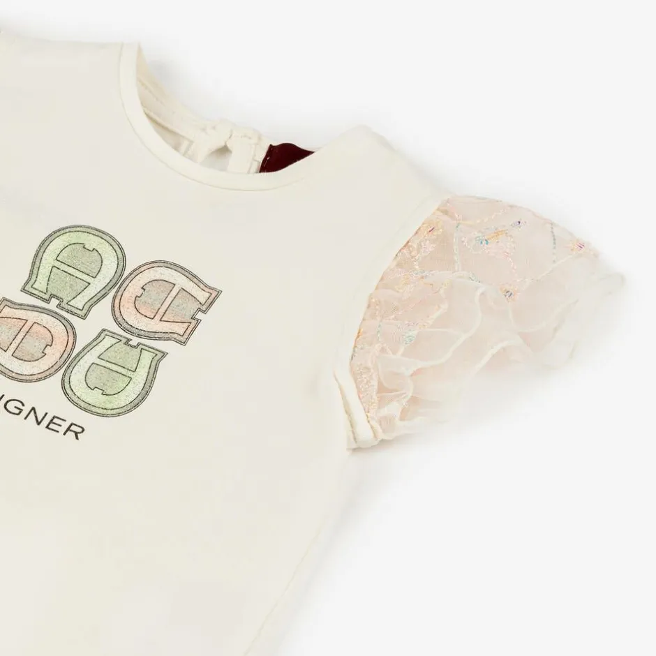 A pretty ivory T-shirt for baby girls by AIGNER, made in comfortable cotton jersey. It has tulle ruffle sleeves, decorated with pastel-coloured floral embroidery and shiny sequins. A glittery pink and green signature 'A' horseshoe logo adds sparkle to the front, and a keyhole button fastening on the back gives a sweet finish.