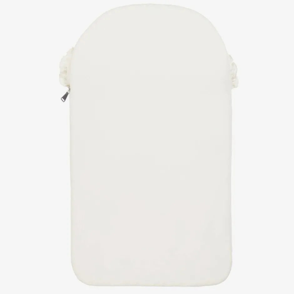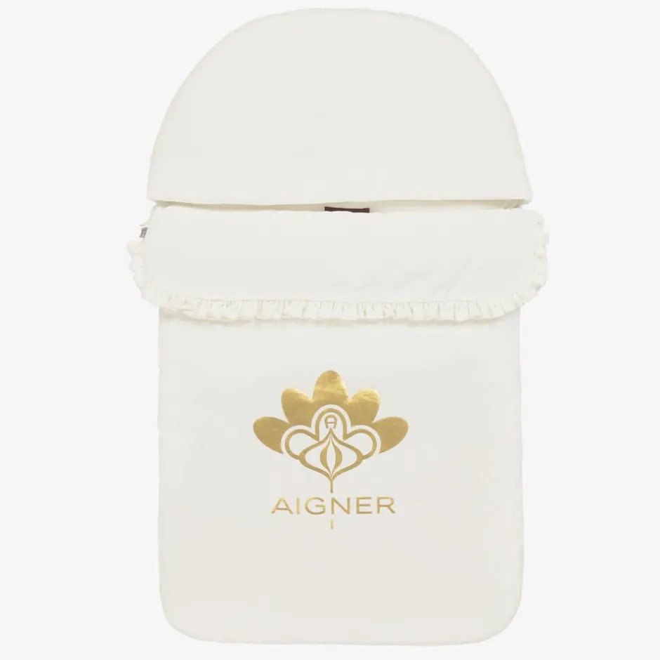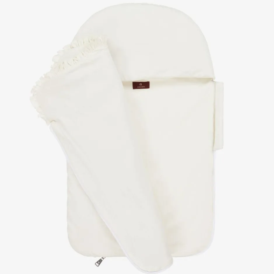 Ivory nest for baby girls by AIGNER, made in super soft Pima cotton jersey. Warmly padded, with a cosy hood, it has a zip fastening down one side and along the base for easy access and a pretty frilled fold-down front. For a distinctive look, a shimmering metallic gold floral logo design can be seen on the front incorporating the signature 'A' horseshoe logo.