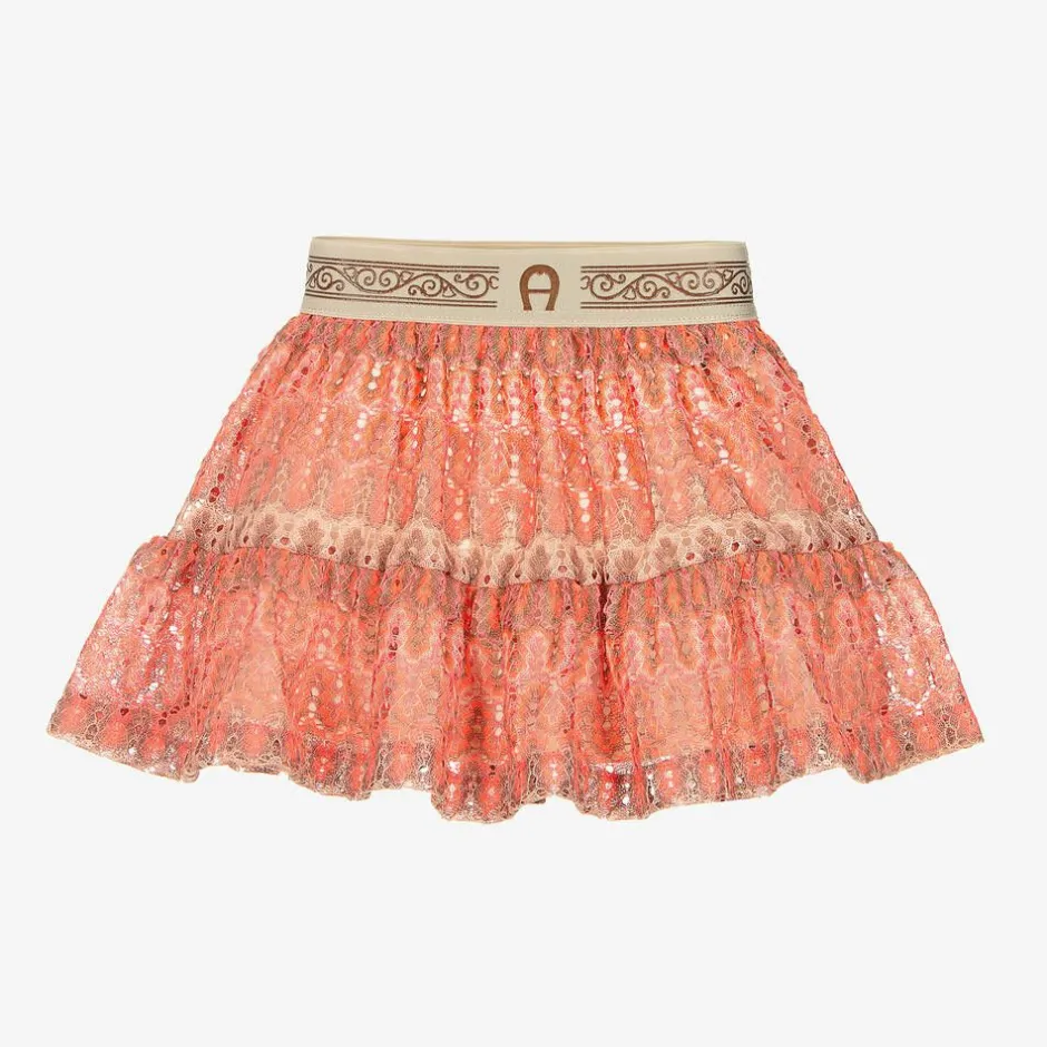 Baby girls neon pink and beige skirt by AIGNER, in a soft and delicate crochet lace weave. Fully lined for comfort and modesty, this pretty skirt has a ruffled hemline for a sweet look. Easy to slip on, it has a beige elasticated waistband with a repeat logo design featuring a filigree pattern and the signature 'A' horseshoe motif.