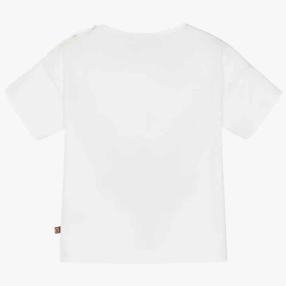Comfortable white cotton T-shirt for baby girls by AIGNER, made in soft, stretchy jersey. It has a pretty butterfly and logo print on the front in shades of pink and pale orange.