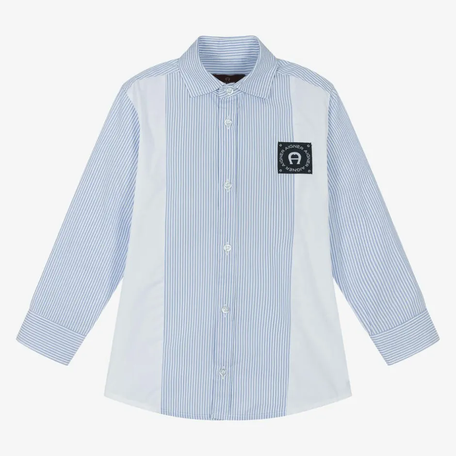In blue and white stripes, a smart cotton shirt for boys by AIGNER, with white panels on the front. Made in soft, lightweight poplin, it has an embroidered logo patch on the chest with the label's signature 'A' horseshoe motif. Branded buttons fasten on the front and cuffs.