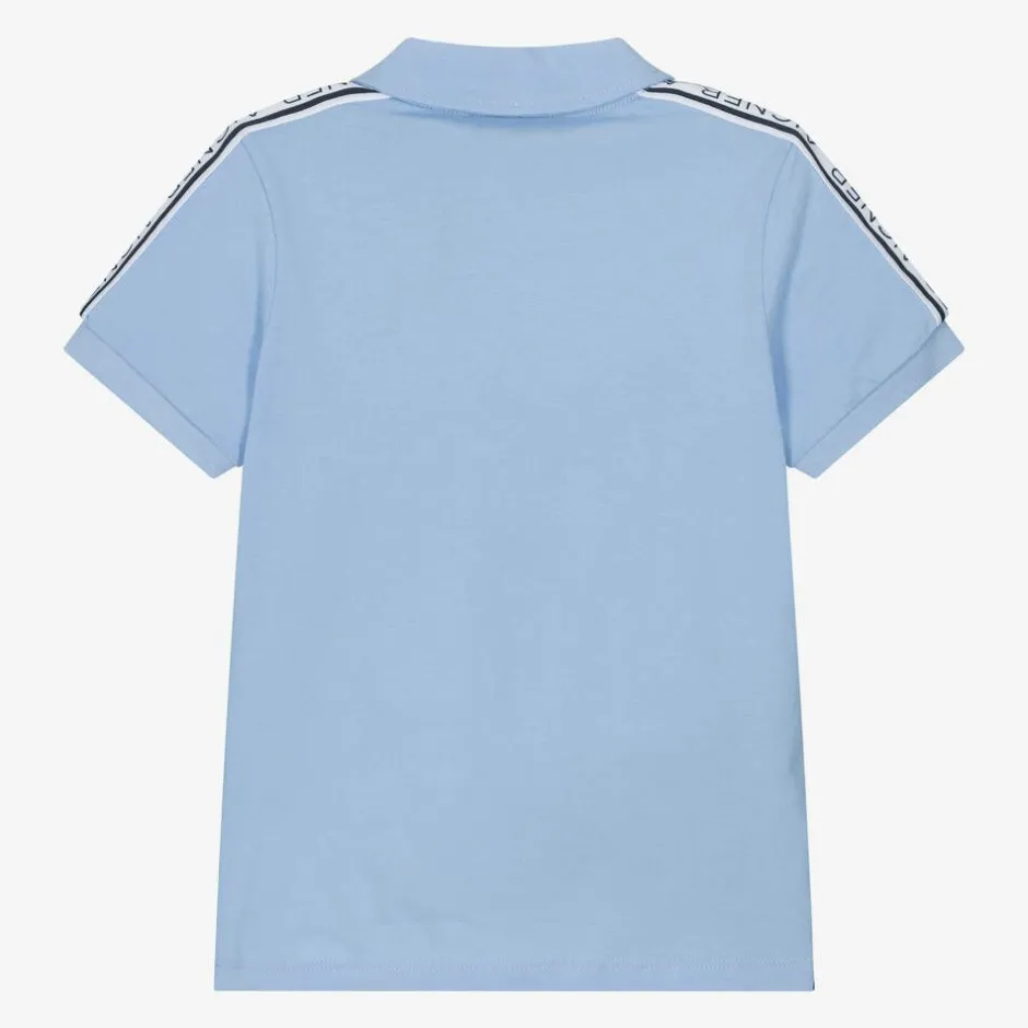 Boys light blue cotton polo shirt by AIGNER, made in soft cotton jersey with branded button fastenings. It has panels of white and navy blue, with logo tape trimming the shoulders for a sporty look. The signature 'A' horseshoe logo can be seen on the chest for a designer finish.