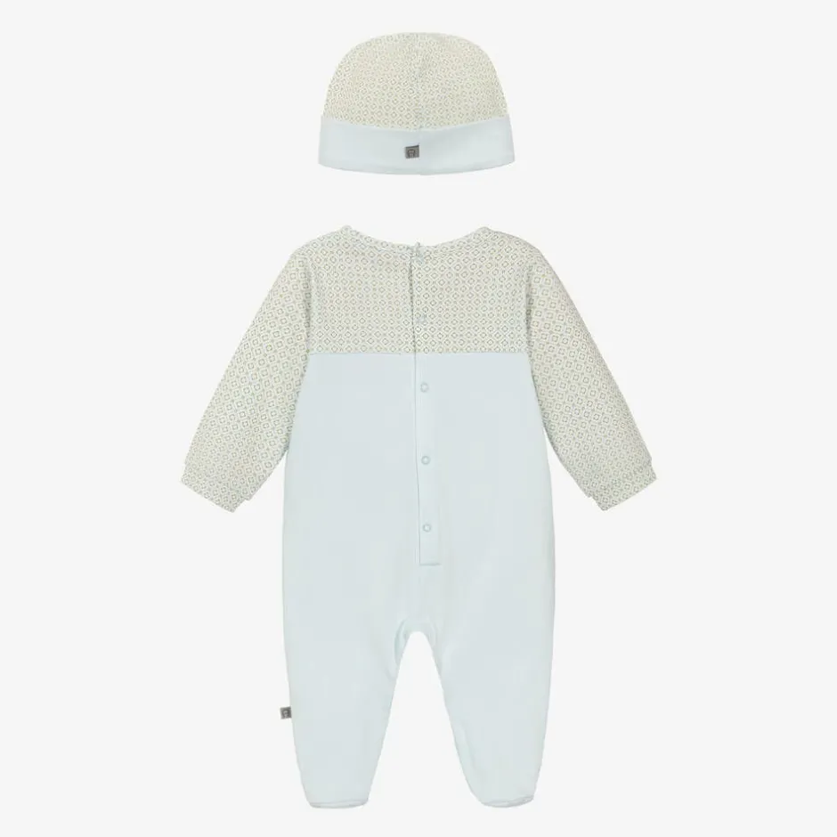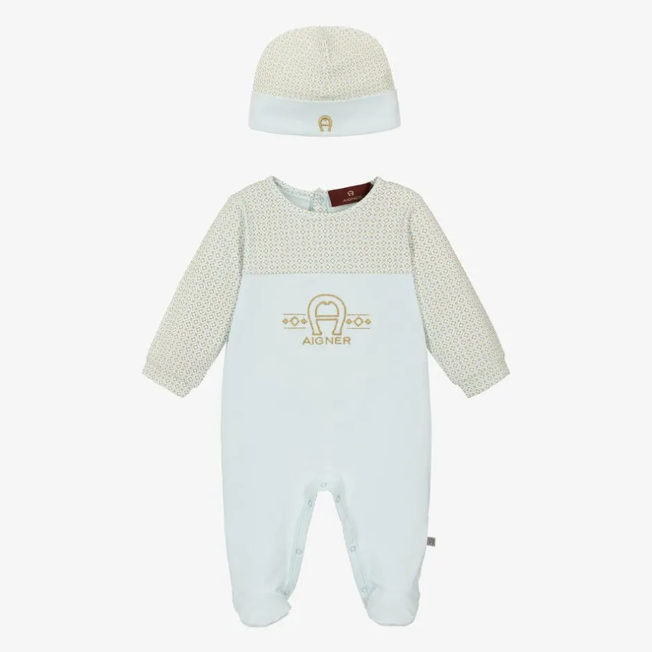 In a pale icy blue shade, this babysuit set for boys is by AIGNER. Made from soft Pima cotton jersey, both pieces are partially printed with a gold branded pattern and are embroidered with metallic gold signature 'A' horseshoe logo designs for a distinct finish. The babygrow fastens with poppers on the back and between the legs and has a logo tab stitched on the side seam. This adorable outfit is completed with a matching layette hat.