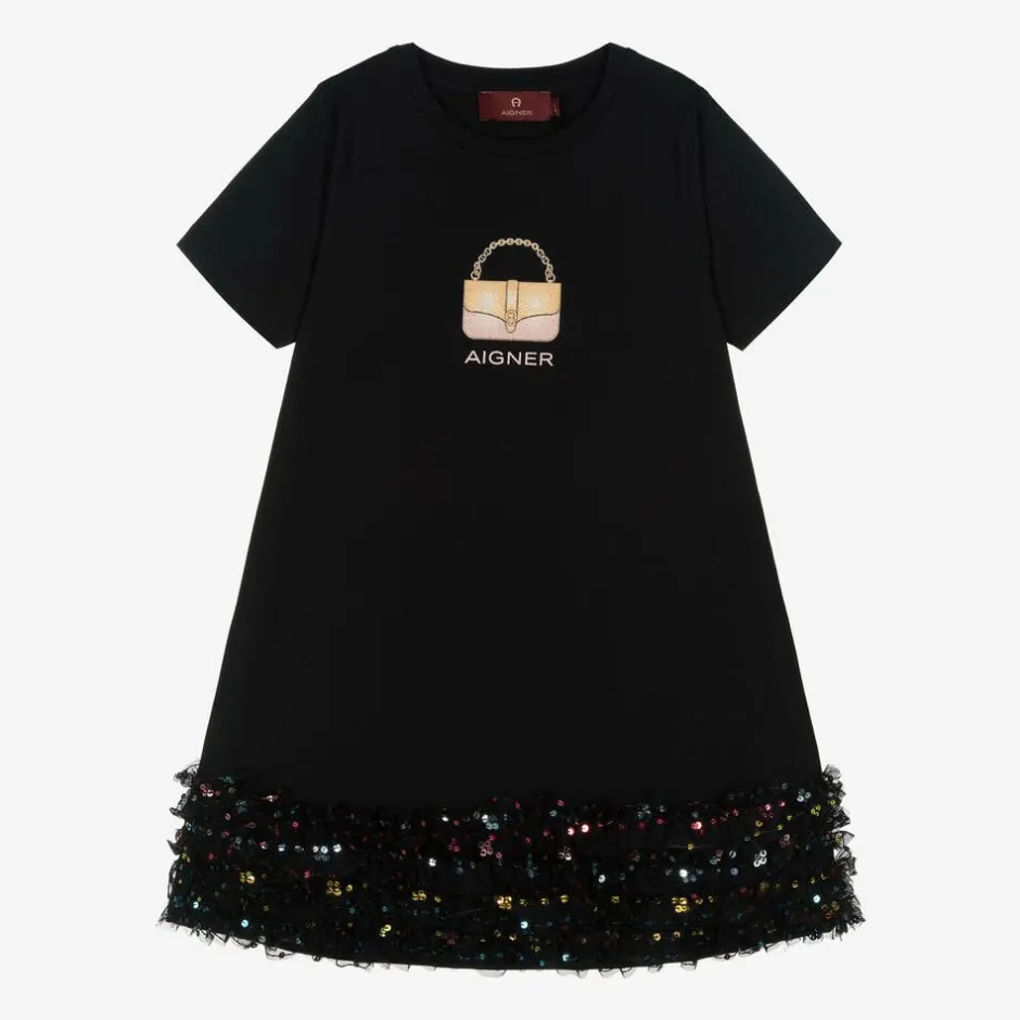 Black dress for girls by AIGNER, made in soft cotton jersey. In a simple, yet elegant design, this comfortable A-line shaped dress has a stylish handbag and logo motif on the front in glittery gold and pink. The hemline is trimmed with colourful sequinned ruffles that sparkle beautifully in the light.