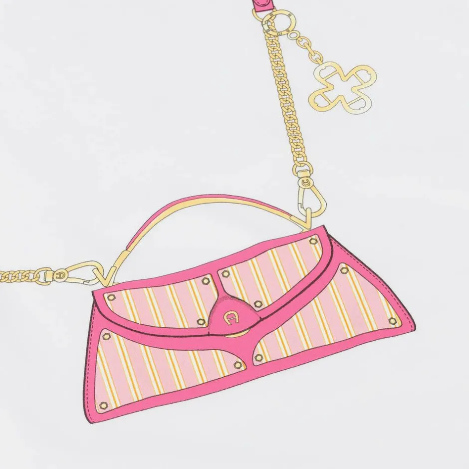 Girls white T-shirt by AIGNER, made in soft cotton jersey. It has cute pink trompe-l'œil handbag print across the front with signature 'A' horseshoe logo gold charms.