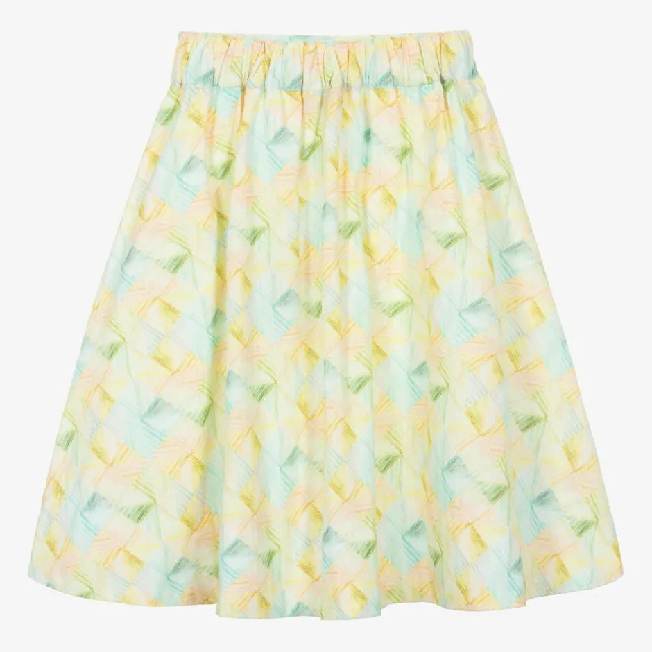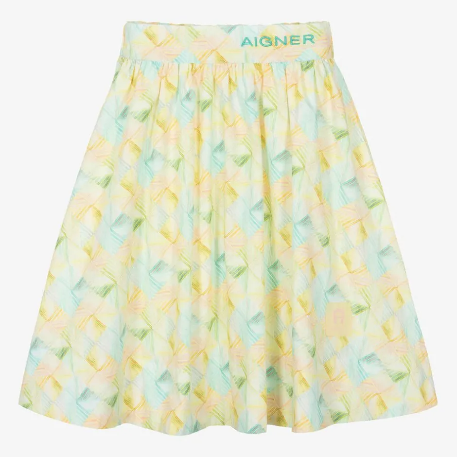 In pretty pastel shades of yellow, blue and green, a geometric print skirt for girls by AIGNER. Designed to fall below the knee, this gathered style is made in soft viscose with a lightweight cotton lining. The waistband is elasticated around the back for ease and embroidered with the brand name on the front. The brand's signature 'A' horseshoe logo can be seen on a patch above the hem.