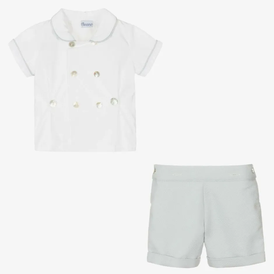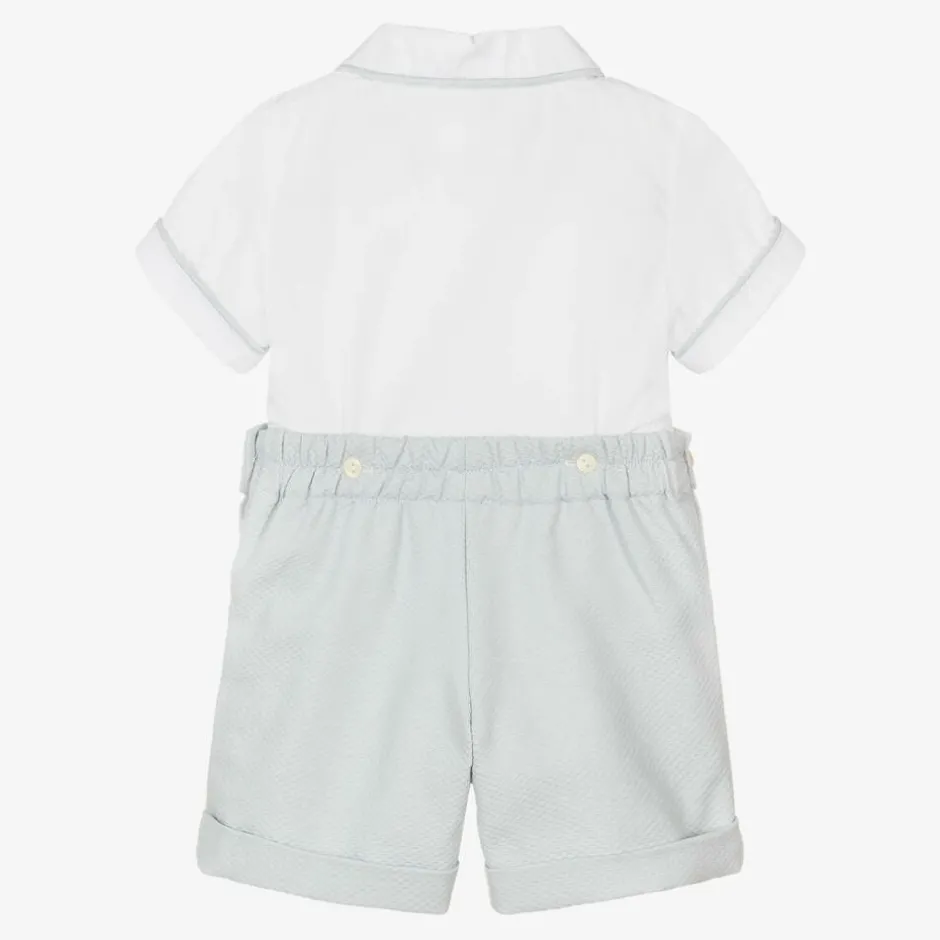Little boys grey and white cotton shorts set by Ancar, made exclusively for Childrensalon. Traditionally styled, the lightweight shirt has a Peter Pan collar, grey trims and mother-of-pearl buttons on the front. The coordinating shorts have a lightweight lining, turn up hems and are partly elasticated at the waist for comfort. Both pieces button together for a neat and tidy look.