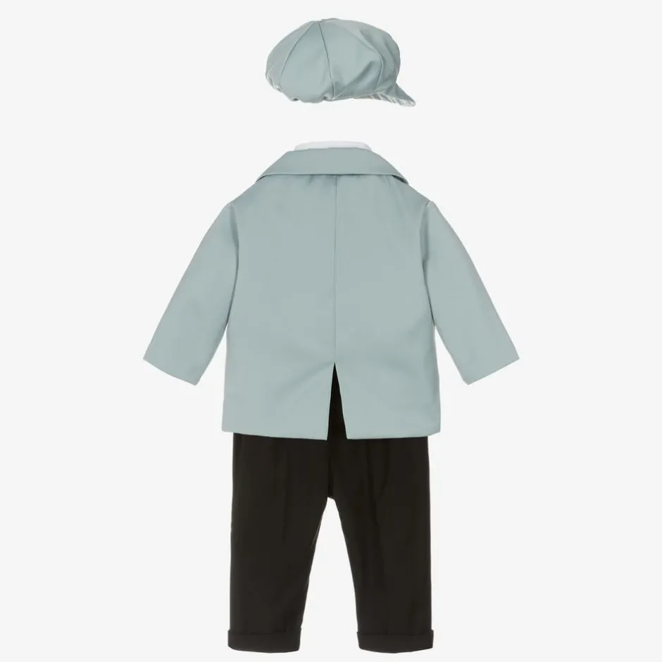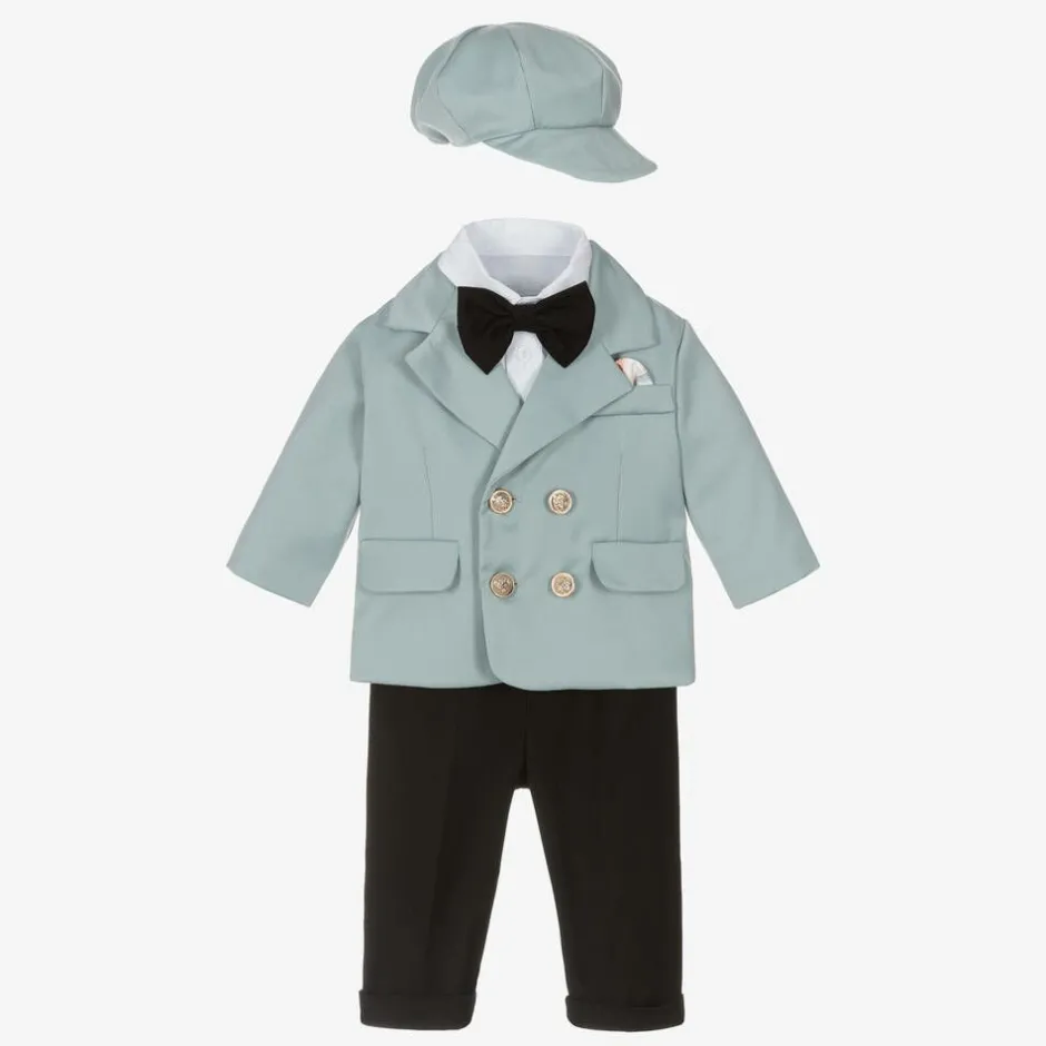 A charming blue and black suit for little boys by Andreeatex, made with a lightweight cotton lining for comfort. Smooth with a gentle sheen, the pale blue double-breasted blazer has gold crest buttons and faux pocket detailing. Easy to pull on, the black, soft brushed twill trousers match the detachable bowtie. A lightweight, white button-up cotton shirt completes the smart look and smaller sizes come with a flat cap.