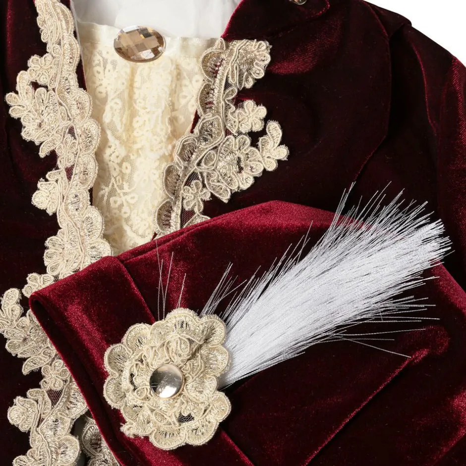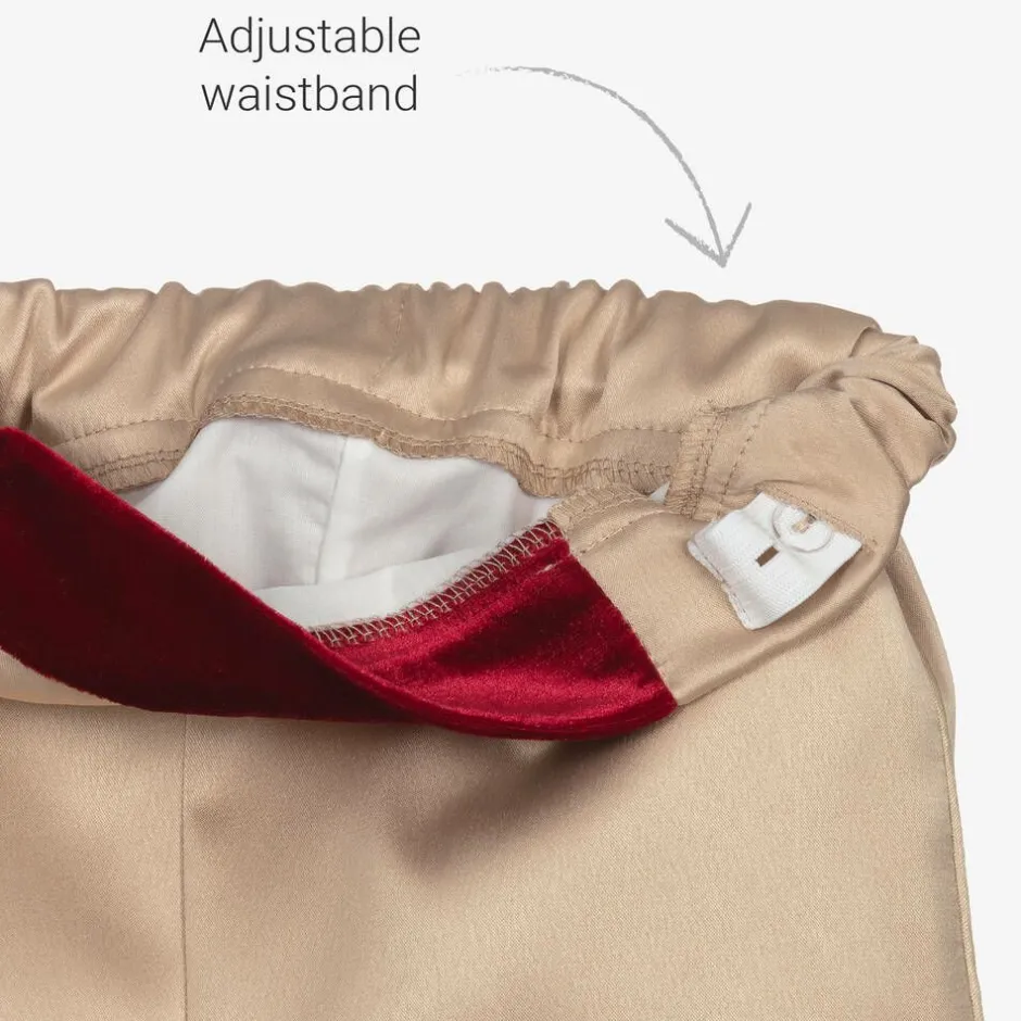 Ideal for special occasions, this red velvet and satin suit for little boys is by Andreeatex. Lined for comfort, the long-line jacket has a luxurious feel with ornate, gold embroidered trim and shiny gold buttons on the stand-up collar. The white, puffed-sleeve, collarless shirt has a traditional lace ruffle, which sits underneath the neckline with a large gold gem and attaches with buttons. The gold satin trousers have a part-elasticated waist for comfort and tie the look together beautifully with the deep red velvet trim on the front. This exquisite set comes with a matching red velvet hat with statement feather detail.
