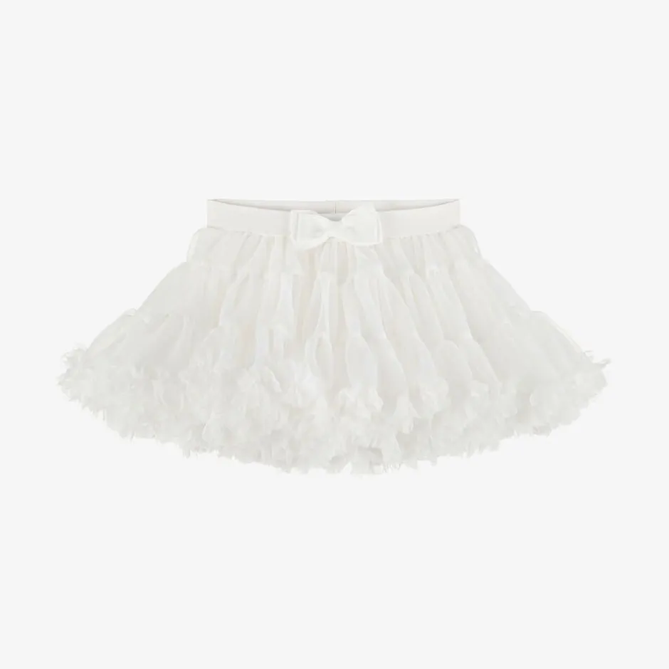 Adorable off-white tutu skirt for baby girls by Angel's Face. This tiered skirt has layers of soft tulle for a voluminous look. There is a grosgrain bow on the front of the elasticated waistband. For comfortable wear, it is lined in soft cotton jersey.