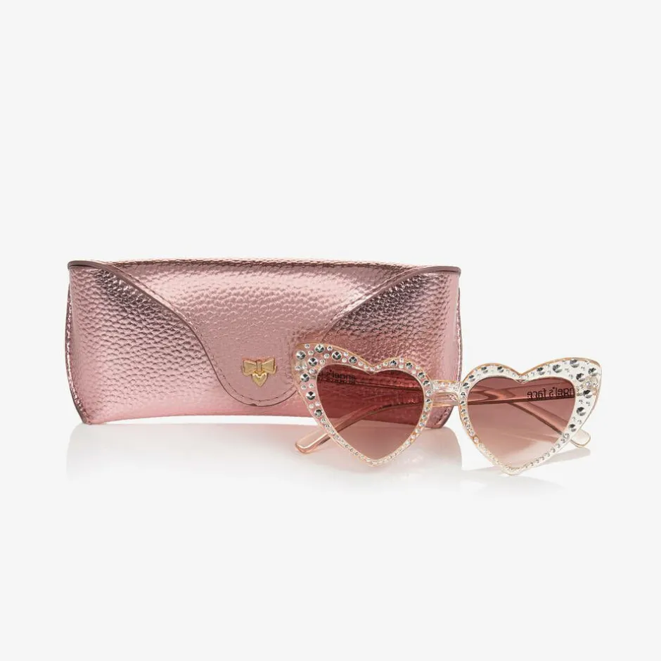 Super cute clear pink heart-shaped sunglasses for girls by Angel's Face, with diamanté decoration. They have tinted lenses and are finished with a gold logo print on the arms. They come in a luxurious pink case, complete with a soft cleaning cloth.