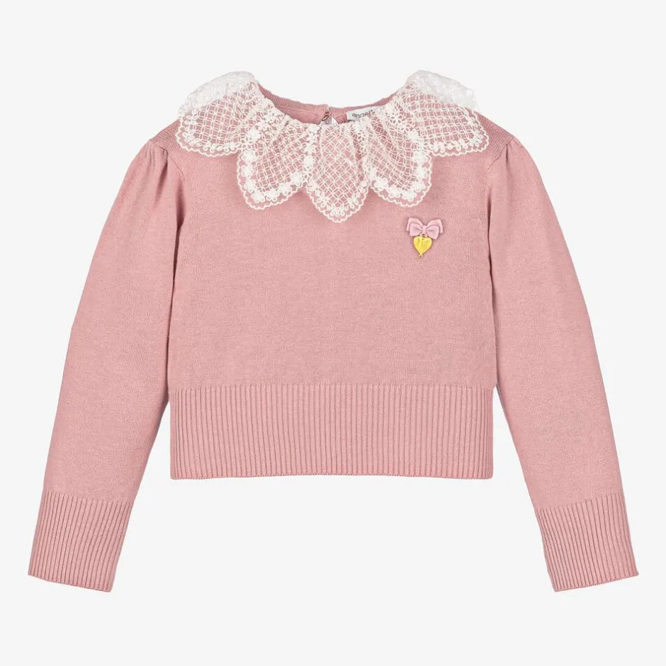 A softly knitted, rose pink cotton sweater for girls by Angel's Face. It features a beautiful floral lace white collar and pretty puffed sleeves. Fastening with a single heart button on the back, it has the brand's signature grosgrain bow and golden heart charm on the chest.