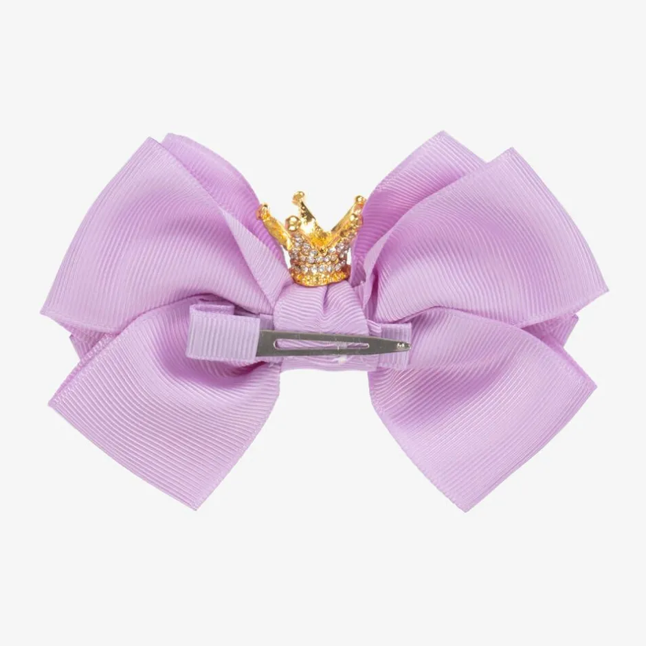 Beautiful lilac purple bow hair clip for girls by Angel's Face, made with luxurious grosgrain ribbon. A lovely finishing touch to her special outfit, it is topped with a sparkly diamanté crown and sits on a simple clip.