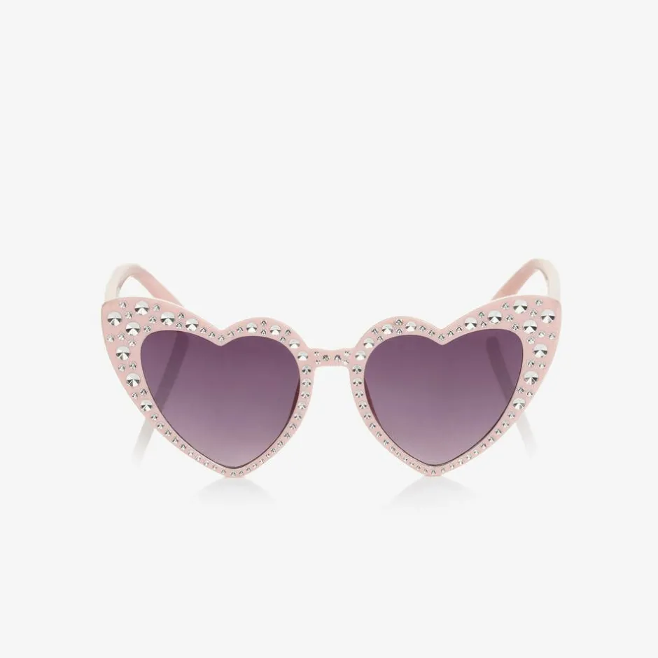 Super cute pink heart-shaped sunglasses for girls by Angel's Face, with diamanté decoration. They have tinted lenses and are finished with a gold logo print on the arms. They come in a luxurious pink case, complete with a soft cleaning cloth.