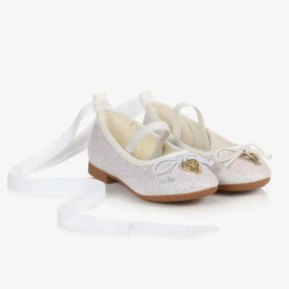 Younger girls ice-white glitter ballerina pumps from Angel's Face, with a bow and golden wing charm detail. Made in soft faux leather, they have a lightly padded insole and rubber outsole. The elasticated bands across will keep the shoes in place, and there are removable ribbon ties that can be worn around the ankles.