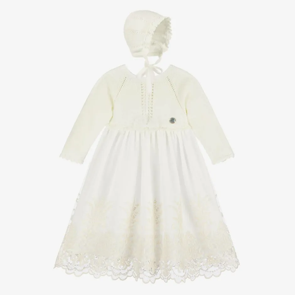 An ivory and white ceremony gown and bonnet set for baby girls by Artesanía Granlei, both signed with mother-of-pearl logo charms. The long-sleeved bodice is made in a soft knit and decorated with beautiful openwork detailing, a tulle bow, and scalloped edges. The cotton-blend skirt is overlayed with embroidered tulle, adding an ornate, classic element to the look. It fastens with pearlescent back buttons. The knitted bonnet ties under her chin to keep it securely in place.