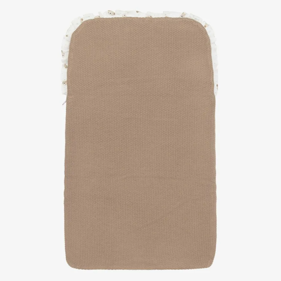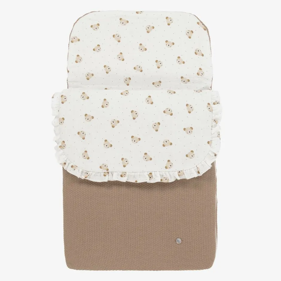 A lovely dark beige baby nest for boys and girls by Artesanía Granlei, in a soft and mid-weight knit with a ruffled trim. Comforting for baby, this padded nest has a fold-down front with a cute bear and dainty polka dot print. Lined with gentle cotton muslin, it has a mother-of-pearl logo charm on the front for a signature touch. The zip fastening goes all the way around which allows the nest to be opened fully and laid flat.
