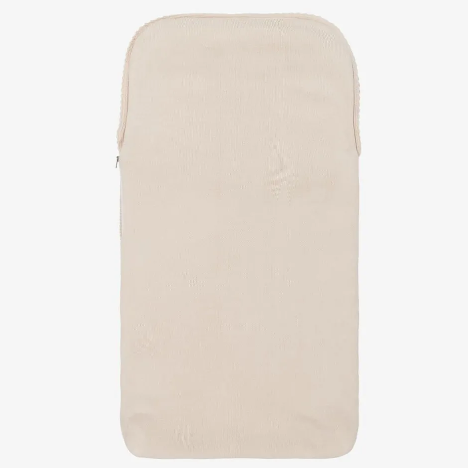 Cute beige knitted nest for baby boys and girls from Artesanía Granlei. Lightly padded for added warmth and comfort, this lovely nest has a white bunny motif on the front, finished with an adorable pom-pom tail and string bow. The side zip fastening makes getting your little one in and out quick and easy.