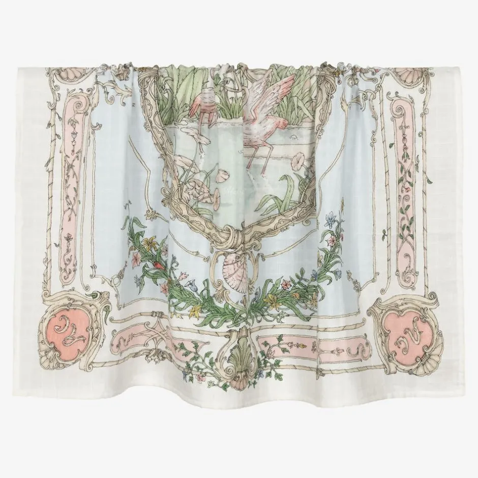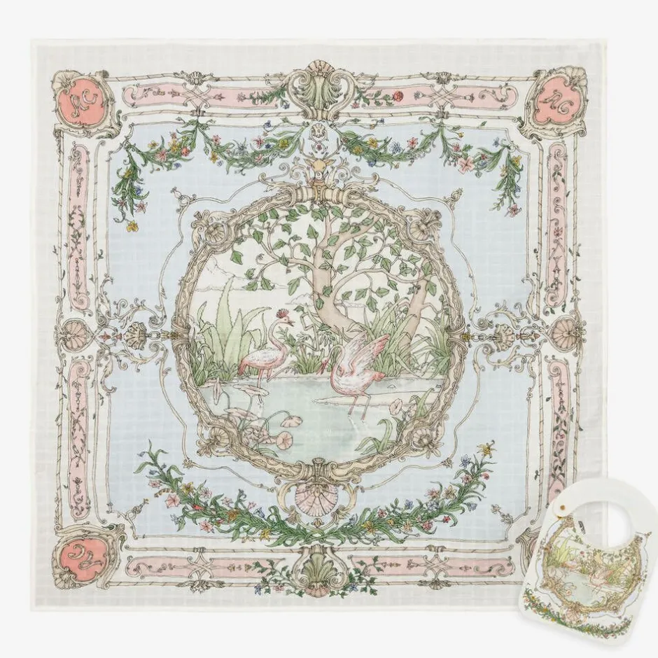 A luxurious ivory swaddle and bib set for baby boys and girls by French brand Atelier Choux, made in soft organic cotton. Lightweight and functional as well as beautiful, it can be used as a tummy time blanket, for baby changing, and added privacy while breastfeeding. The matching, double-sided bib has easy-to-use adjustable popper fastenings for an ideal fit. Both pieces are beautifully illustrated with detailed flowers and birds and are presented in a lovely gift box.