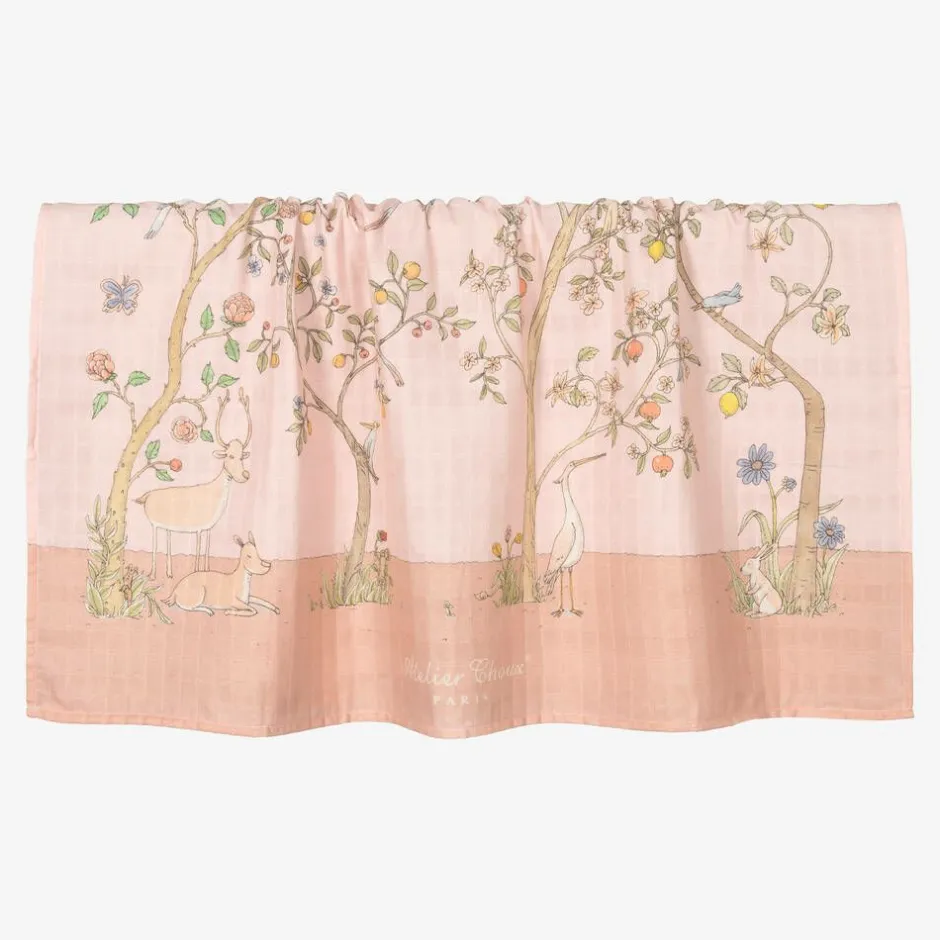 Stunning pink swaddle for baby girls from luxury French brand Atelier Choux Paris, made in soft organic cotton muslin. Illustrated by famed Swedish artist Mattias Adolfsson, the front is accented with a floral tree design, with hanging fruits and animals. It can be used as a light blanket, changing surface, or for privacy while breastfeeding. It comes with a lovely gift box.