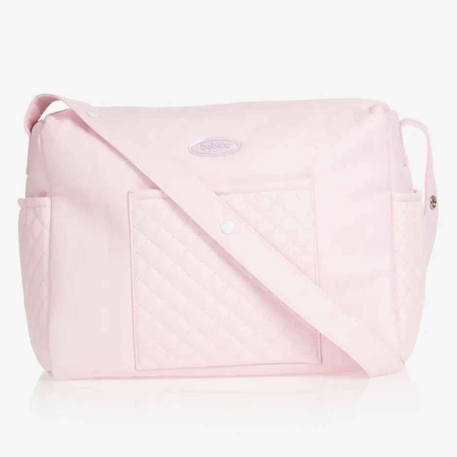 Pale pink changing bag by Babidu, made in softly padded faux leather. It has quilted pockets outside and fastens with a zip. Inside it has a lightweight cotton lining with elasticated straps and various pockets. The handle has poppers, which when fastened create loops for use on the stroller.
