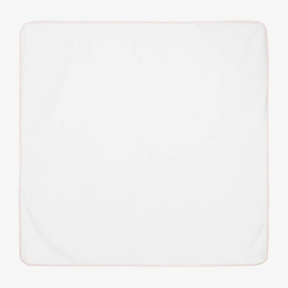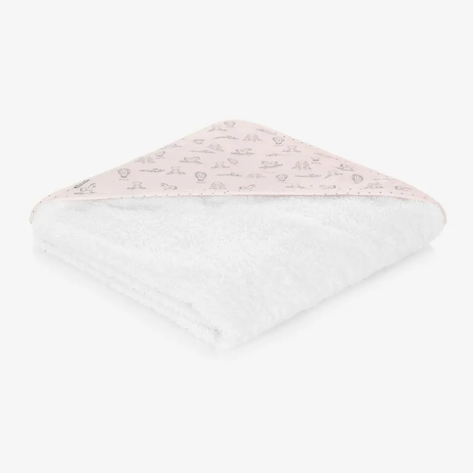 Lovely white hooded towel for baby girls by Babidu. Made in soft cotton towelling, it is ideal for keeping little one warm and dry after bath time. The sides and hood are trimmed in pink cotton jersey and printed with a cute pink nursery print.