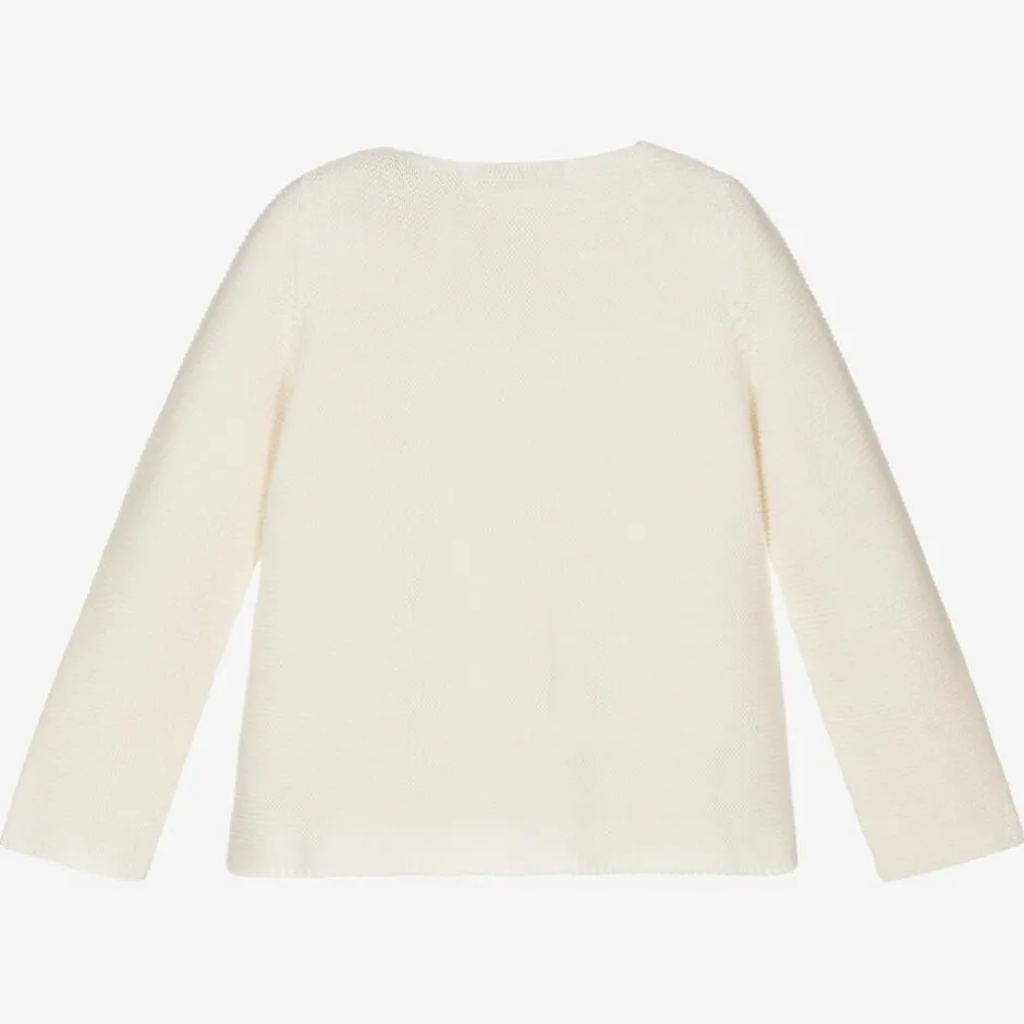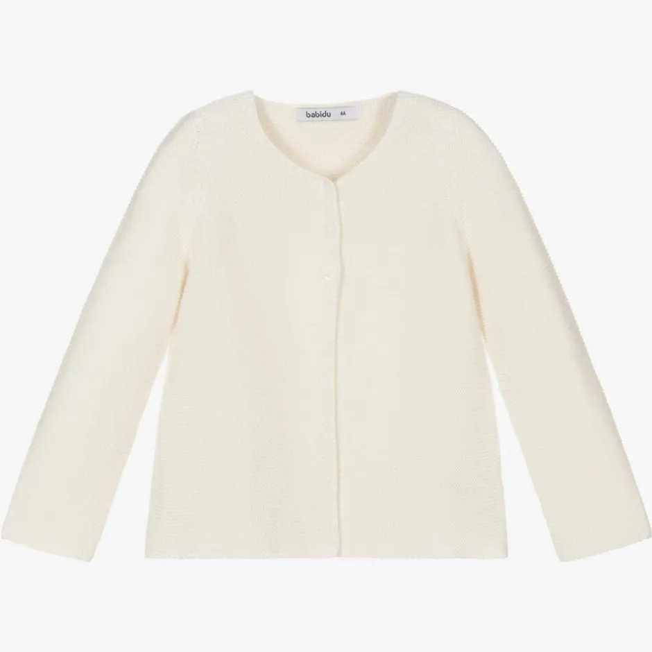 Ivory knitted cardigan for boys and girls by Babidu, made in mid-weight cotton. The boxy cut creates a traditional look and it fastens with cute pearlescent buttons on the front.