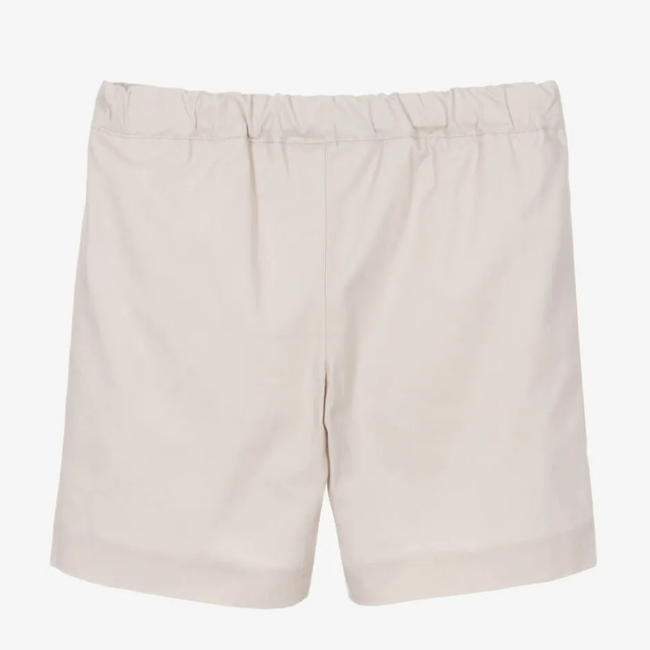 Smart-casual beige cotton shorts for boys by classic British designer Beatrice & George, exclusive to Childrensalon. Ideal for warmer days, they are made in lightweight twill with inverted pleat detailing on the front. Lined in voile for comfort, they have a semi-elasticated waistband with an adjustable waistband for a great fit.