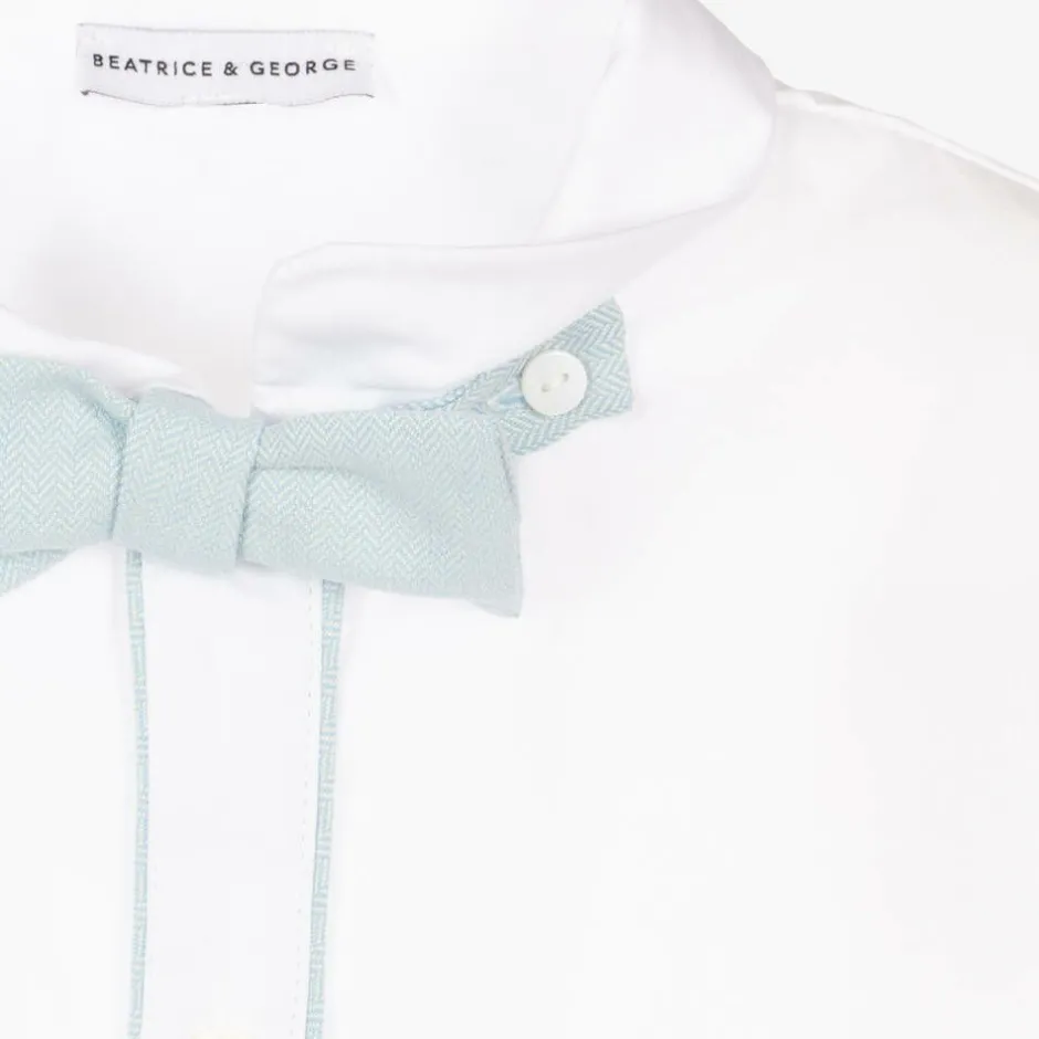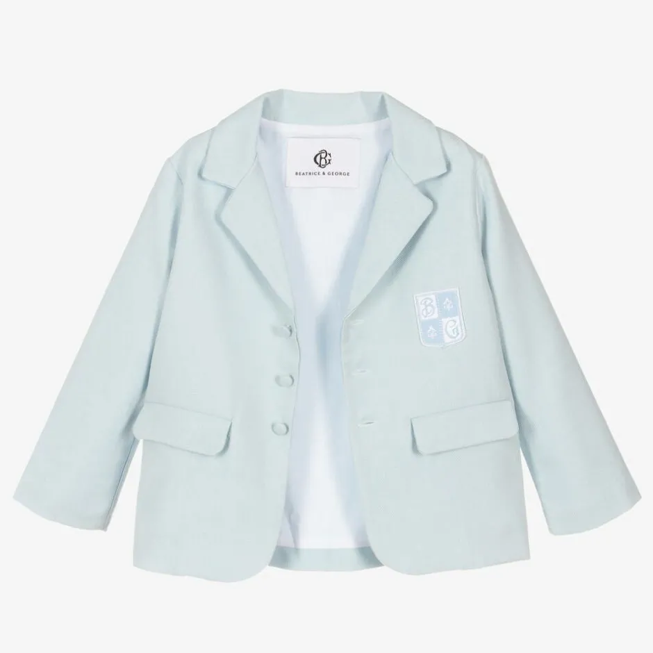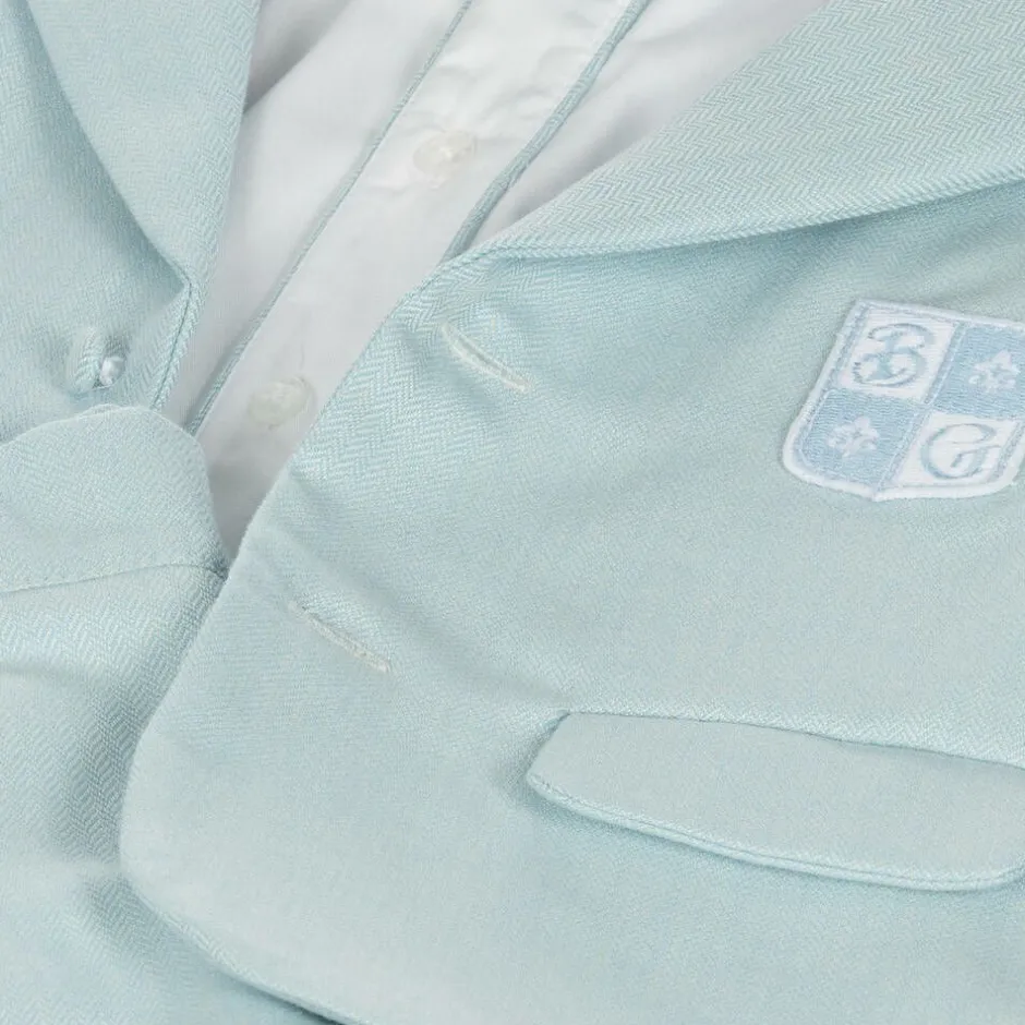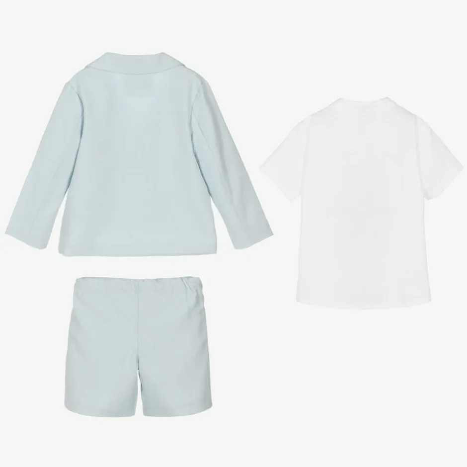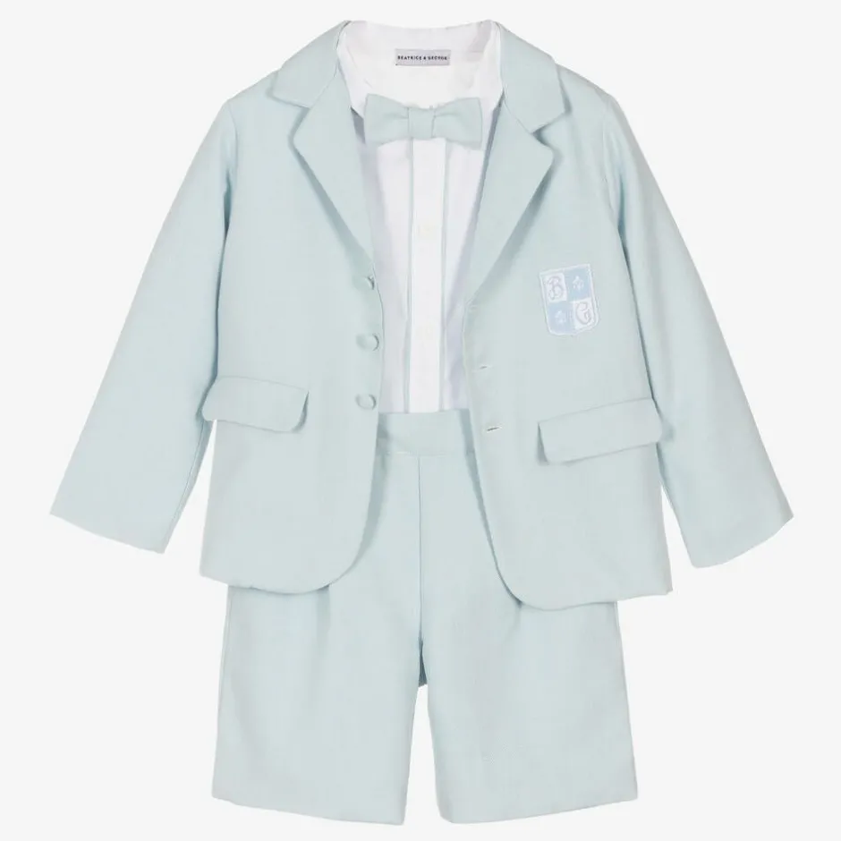 Smart pale blue four piece shorts set for younger boys by Beatrice & George, exclusive to Childrensalon and ideal for a special occasion. The white, long-sleeved, cotton poplin shirt has pale blue herringbone piping either side of the placket, with logo button fastenings on the front and a button-fastening herringbone bow tie. The coordinating pale blue jacket has an embroidered crest logo badge on the front with covered button fastenings, front pockets and a white voile lining. The matching lined shorts have a comfortable, adjustable waistband that is elasticated around the back for a good fit.