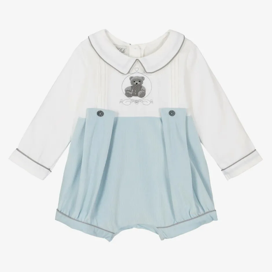 Blue and ivory shortie for baby boys by Beau KiD. The ivory top and long sleeves have a ribbed design with pintucks and a cute embroidered bear on the front. There is a smart collar trimmed with grey piping to match the piping on the cuffs. The bottom part of the shortie is blue with a textured waffle effect and brushed feel. It has matching grey trims and pleats on the front with navy blue button trims. This lovely traditional piece fastens with buttons on the back and poppers between the legs.
