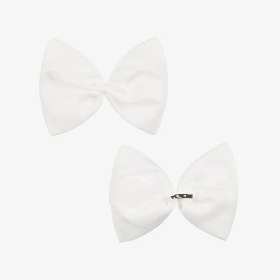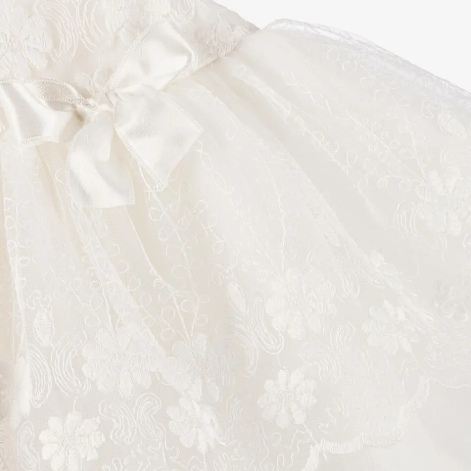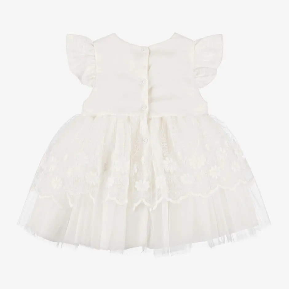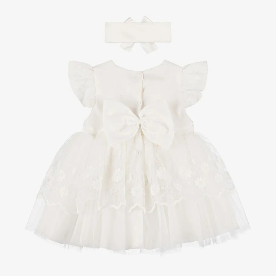 A beautiful ivory special occasion dress for baby girls by Beau KiD. Made from layers of lightweight tulle, it has a floral-embroidered tulle overlayer with scalloped edging for a sweet and delicate look. It has a silky underlayer and a smooth woven cotton-blended lining for extra comfort. Fastening with poppers, there is an appliqué satin ribbon bow on the front, frilled short sleeves, and a detachable bow brooch that can be secured with a safety pin on the back for a delightful finish. A coordinating headband completes this elegant style.