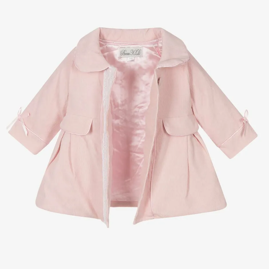Pretty pale pink coat and bonnet for baby girls by traditional British brand Beau Kid, with beautiful white lace and pink ribbon trims. Made in soft cotton corduroy, the coat has satin piping and sweet satin ribbon bows on the cuffs, with faux pockets above the front inverted pleats and a satin lining. The matching bonnet fastens with satin ribbon ties under the chin.