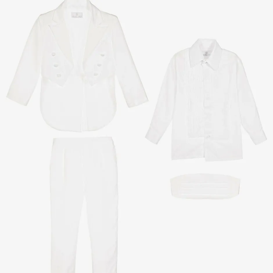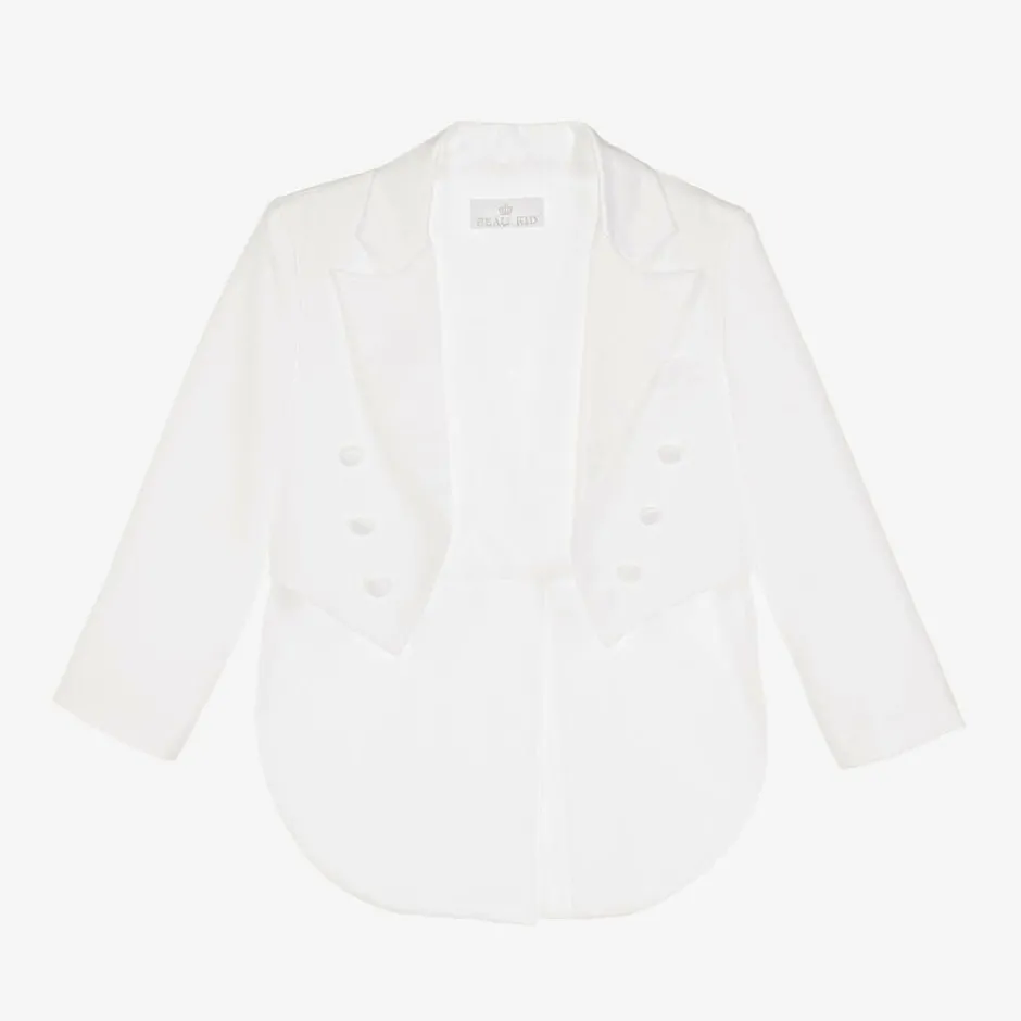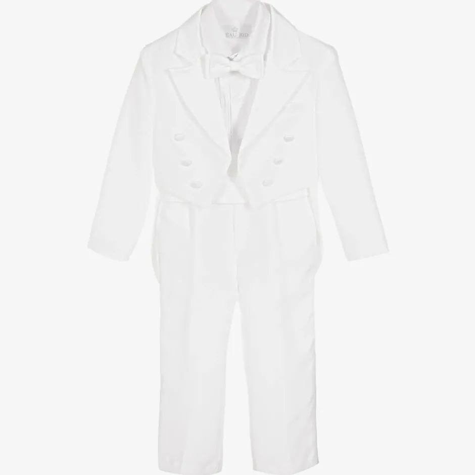 Boys white tuxedo suit by Beau KiD. The tail jacket and trousers are made in a lightweight twill, with satin trim to match the cummerbund and bow tie. The jacket is designed not to fasten and the trousers have an elasticated waist. It comes with a white cotton blend dress shirt. The fit can be quite big, so we recommend you check measurements before ordering.