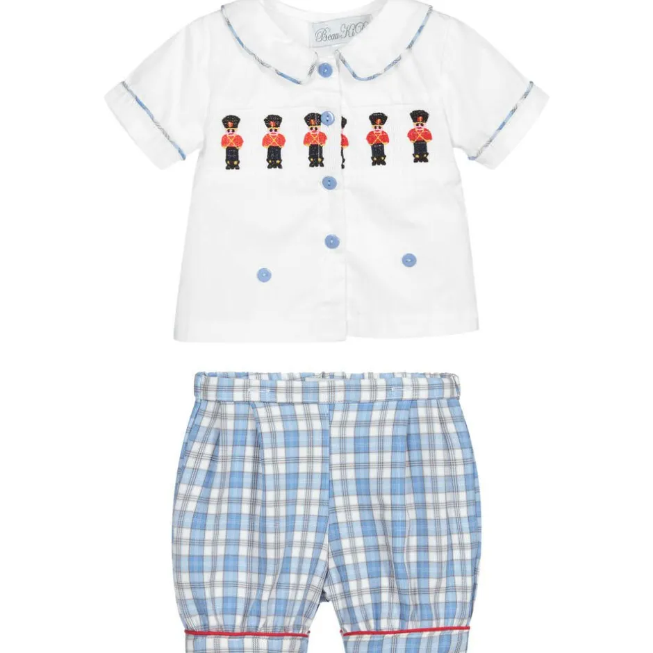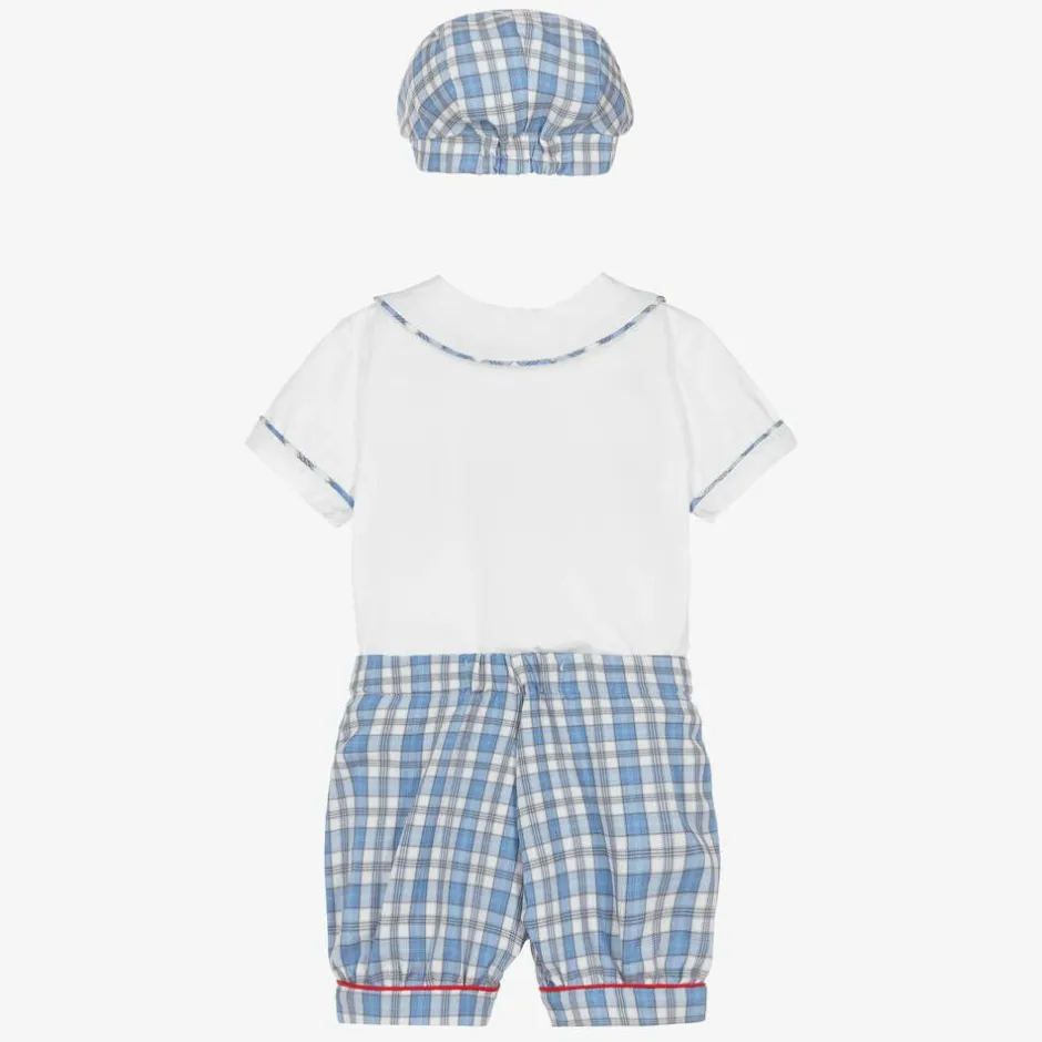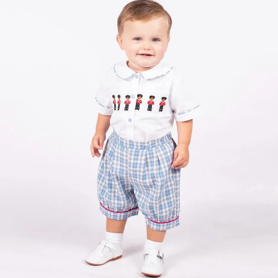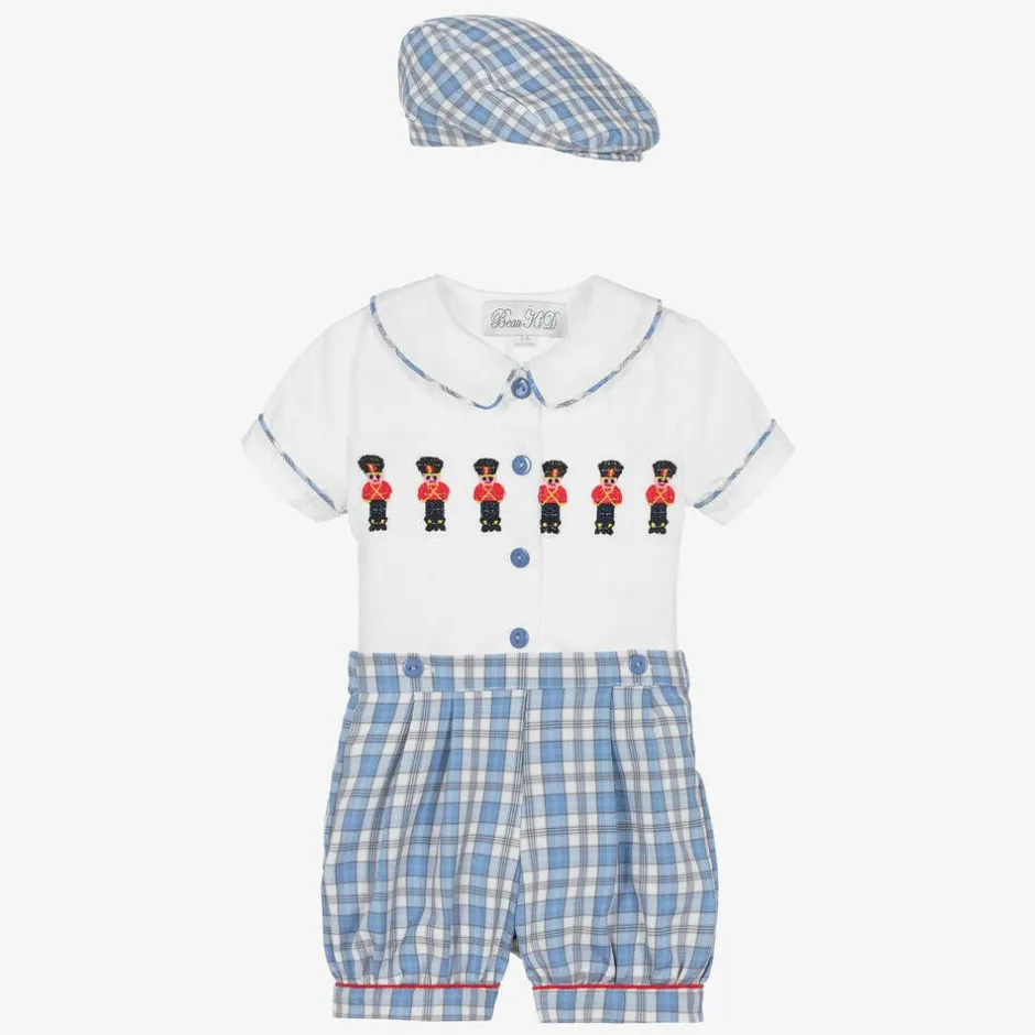 Blue and white buster suit and hat set for baby boys by Beau KiD, made in soft, lightweight cotton. The white shirt has blue checked trims and buttons. It is smocked on the chest, with embroidered red and black soldiers. The blue and white checked shorts have red trims and fasten to the shirt with buttons. A matching hat completes the set.