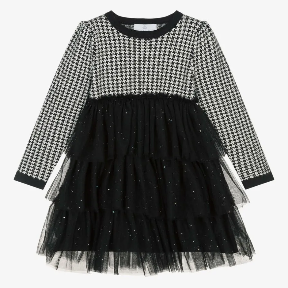 A black knitted dress for girls by Beau KiD, stylish and fun for a party look. Knitted in a soft viscose blend for comfort, the top has a timeless white houndstooth pattern whilst the skirt has a tulle overlay with glitter for added sparkle.