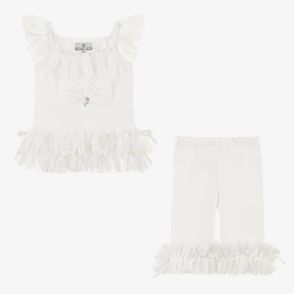 Lovely ivory cotton leggings set for little girls by Beau KiD. Made in soft, comfortable jersey, it has ruffled lace and tulle trims and is embellished with satin ribbon bows. The vest top has a jersey bow on the chest decorated with a silver 'heart and arrow' diamanté charm for a touch of sparkle. The leggings have a gently elasticated waist.