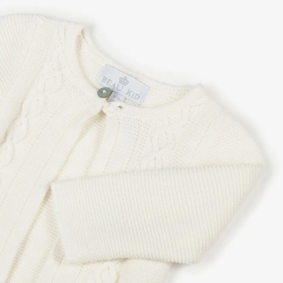 Ivory cardigan for baby boys and girls by Beau KiD, knitted in soft cotton. Ideal for layering, it has a lovely cable pattern on the front and fastens with a single mother-of-pearl button on the front.