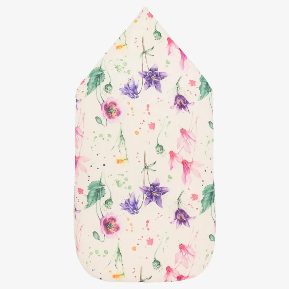 Lovely padded ivory nest for baby girls by Beau KiD, patterned with pink, purple and green flowers. Soft and lightweight with a jersey upper part, it has a large fixed bow and a band of beige lace across the middle. As baby grows, the popper fastenings on the hood can be opened out to create a flat surface.