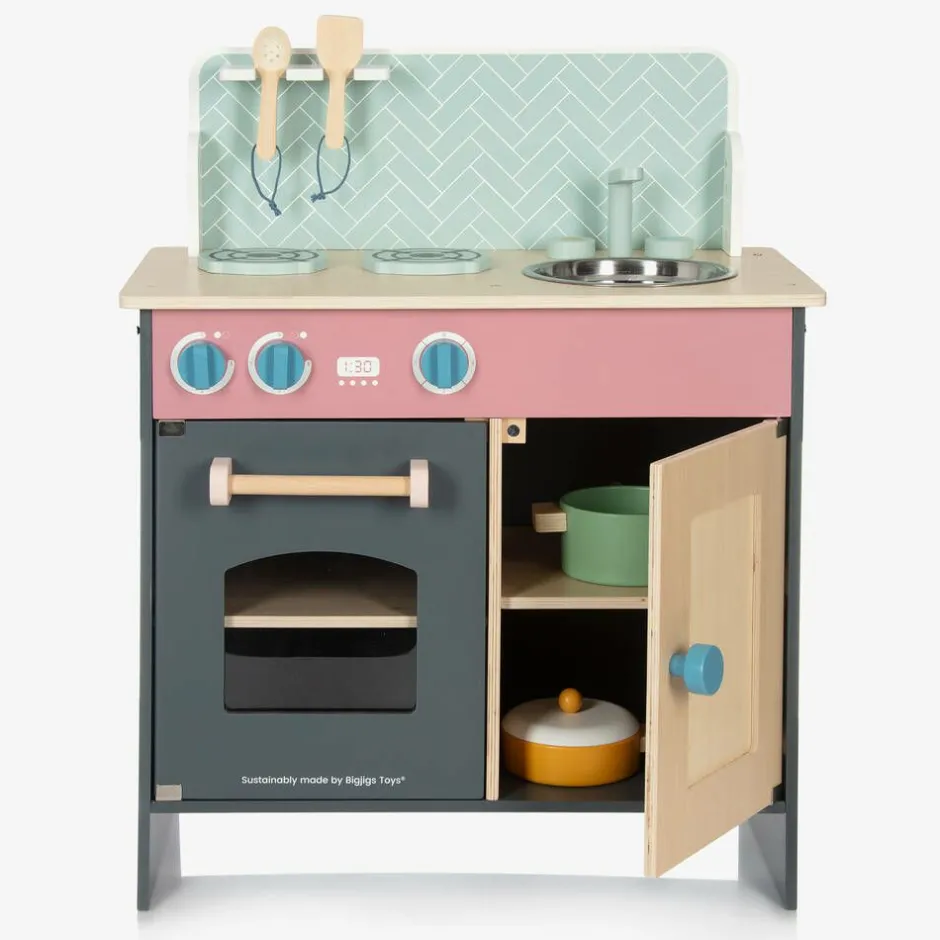 Great for budding chefs, the Simply Scandi kitchen play set for boys and girls is designed by Bigjigs. Ideal for developing imaginative play, your little one will enjoy getting creative in this authentic looking kitchen, with heating dials to turn and twin hobs for pretend cooking. There is large oven and useful cupboard for storing ingredients. It comes complete with two pots and pans, and wooden utensils ready to prepare all those delicious recipes.