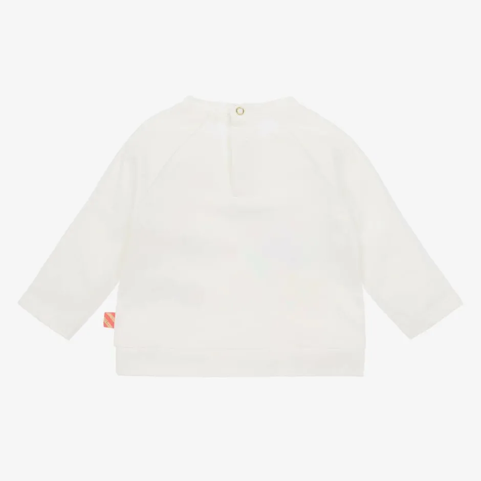 Ivory cotton top for little girls from Billieblush, made in super-soft jersey. Full of character, it has a fun print of cartoon-style teddy bears, cats, stars and clouds. Iridescent sequins decorate the front for added shimmer and sparkle. It fastens with poppers on the back to help with dressing.