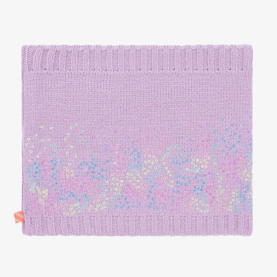 Lilac purple snood for girls by Billieblush, made in a soft, double layer knit. Cosy and warm with ribbed trims, it is decorated with colourful sequins for a sparkly finish and it has a glittery blue rubberised logo on the front.