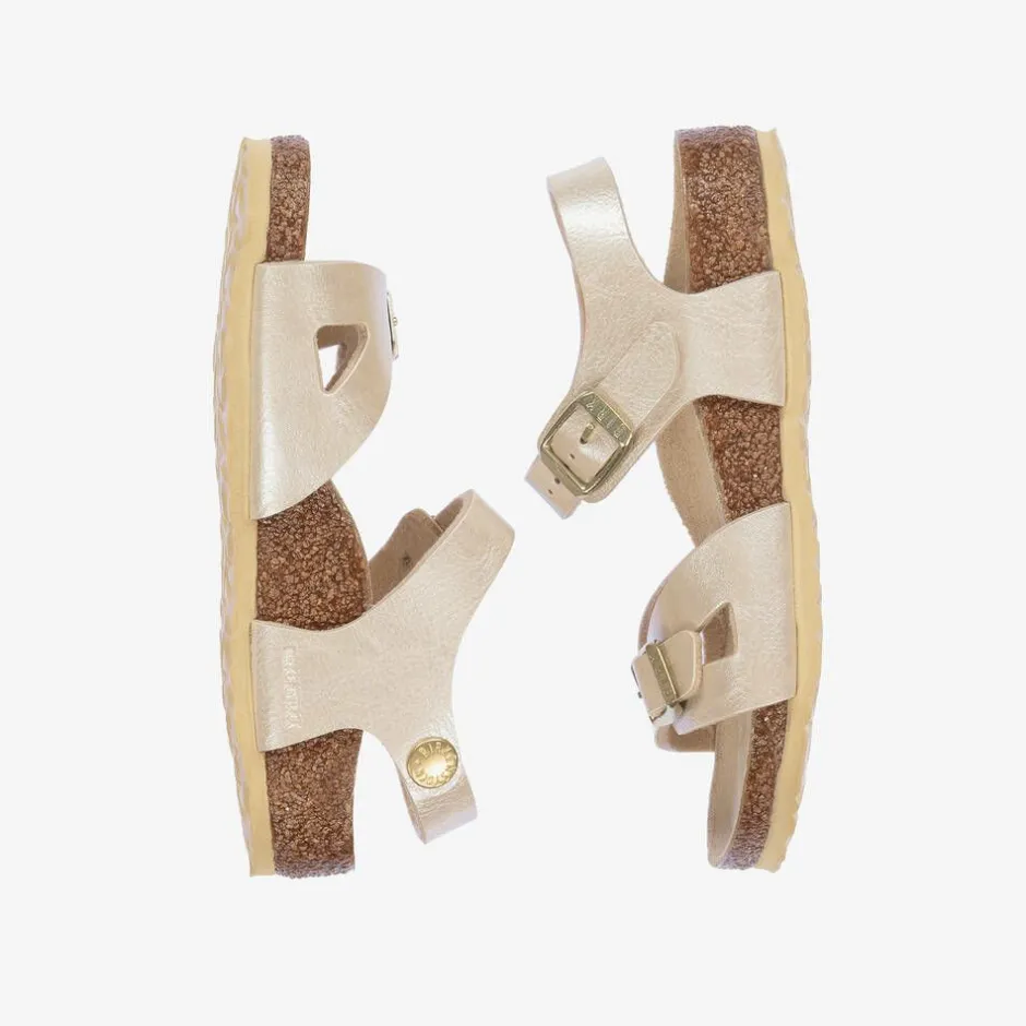 Stylish pearlescent ivory sandals for girls by Birkenstock. The straps are made from Birko-Flor soft faux leather and fasten with buckles. These sandals have contoured, suede leather footbeds that promote good walking posture, making them a great choice for growing feet. The outer soles are made in soft rubber, designed with ridges to improve grip.