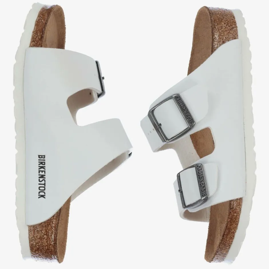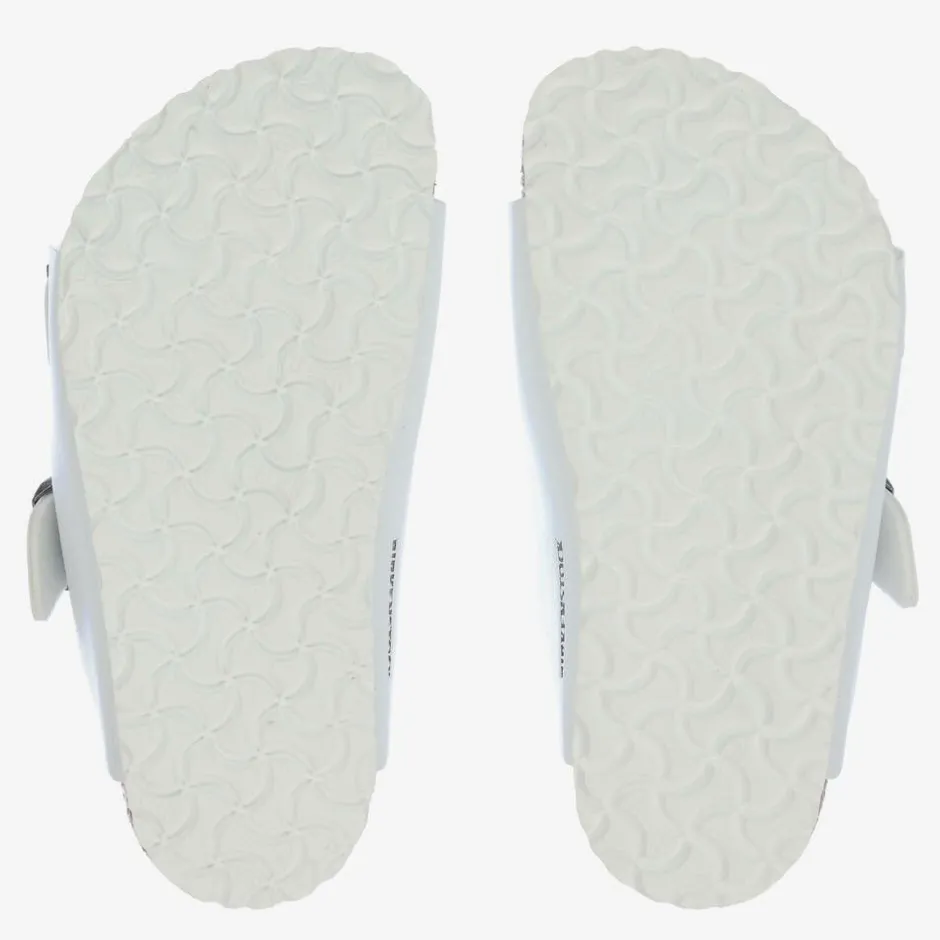 White sandals for boys and girls by Birkenstock, with silver buckle fastening on the Birko-FlorĀ® faux leather straps. German-made, these sandals have a unique contoured footbed that promotes good walking posture, making them a great choice for growing feet. For added comfort, the straps have a soft fleecy lining.