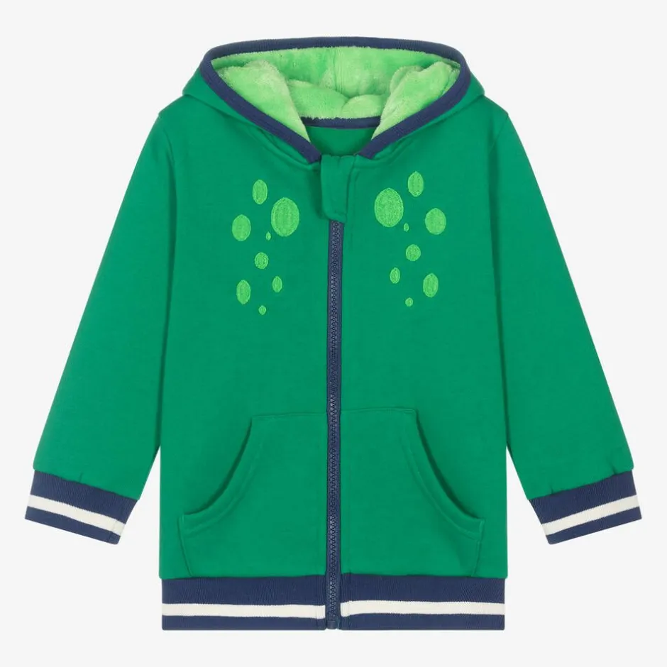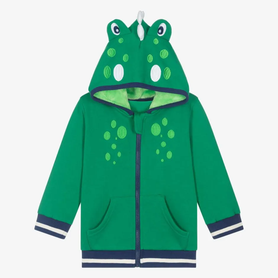 From Blade and Rose, cute green zip-up top for little boys and girls made in cotton jersey. For fuss-free dressing it fastens with a zip on the front and has ribbed trims for added comfort. The hood is lined with super soft fleece and finished with a dinosaur face with 3D spikes ideal for playing make-believe as Maple the dino.
